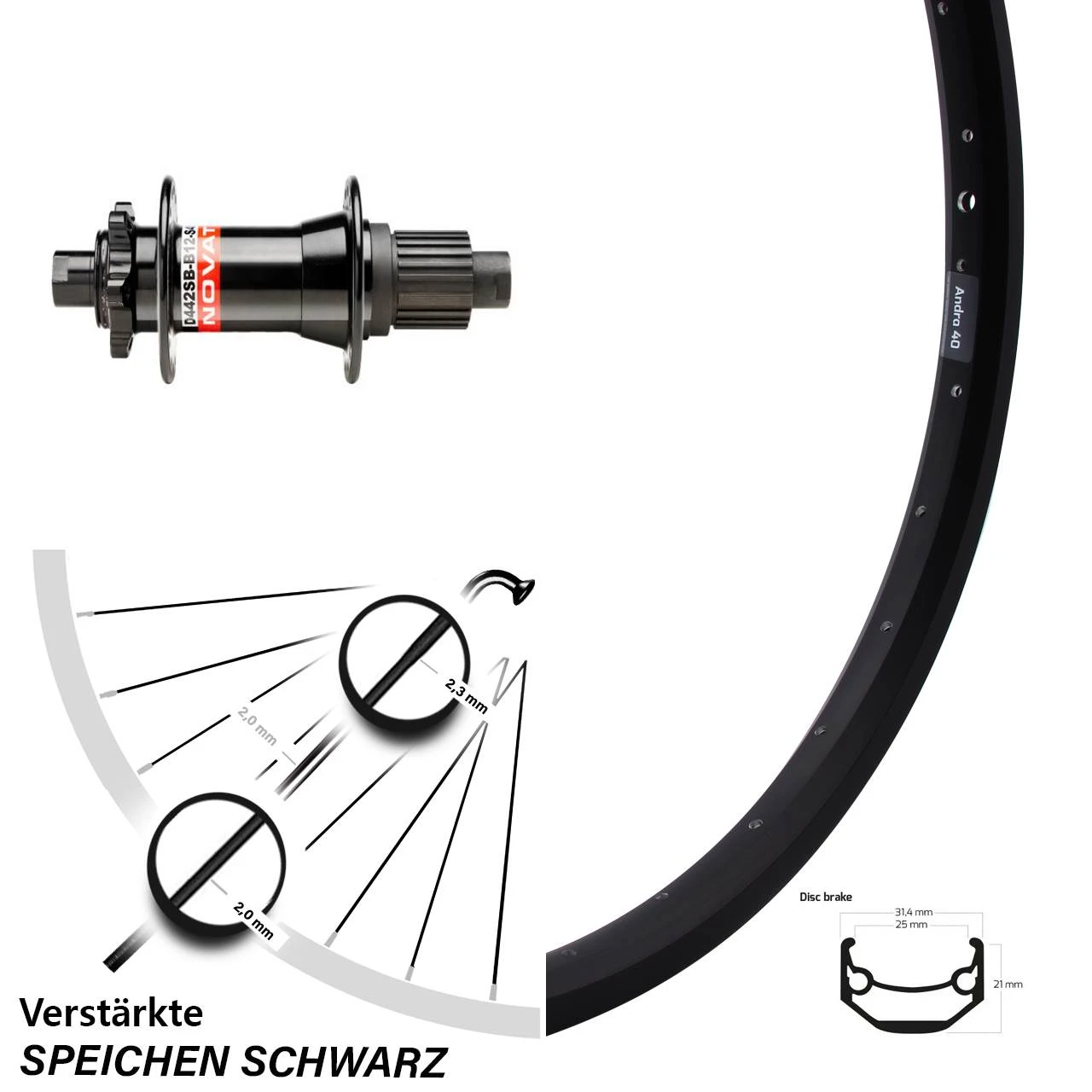 Technische Daten Hinterrad Ryde Andra 40 Disc schwarz und Nabe Novatec D442SB Boost Micro Spline