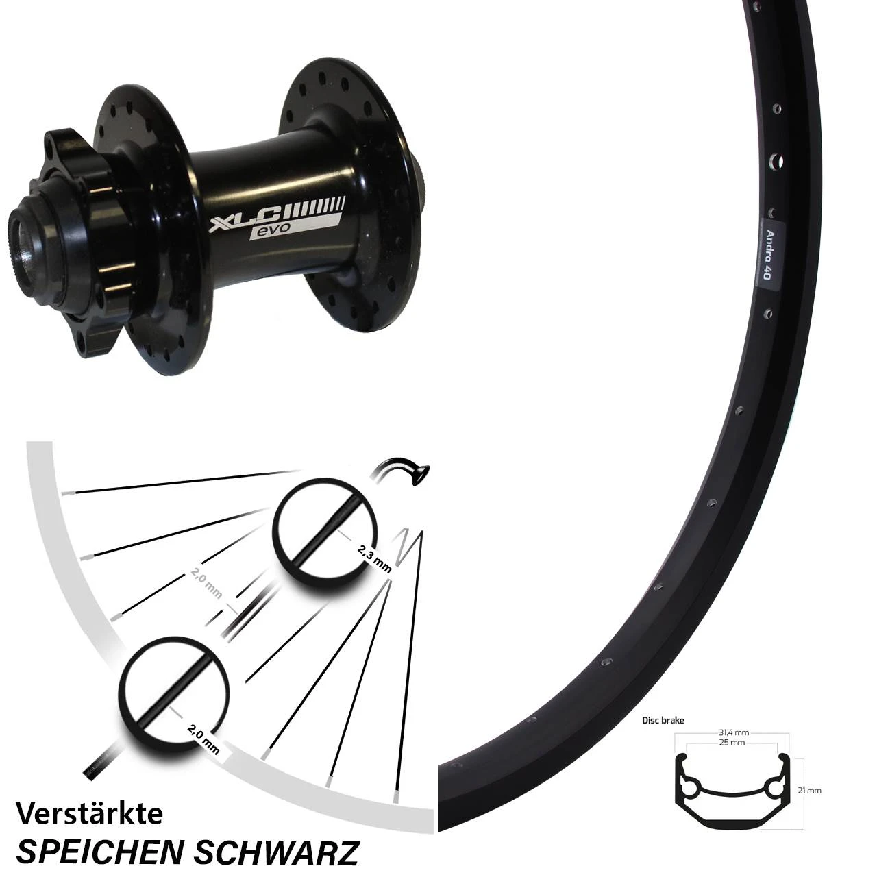 Technische Daten Vorderrad Ryde Andra 40 Disc schwarz mit Nabe XLC Evo Disc schwarz Steckachse