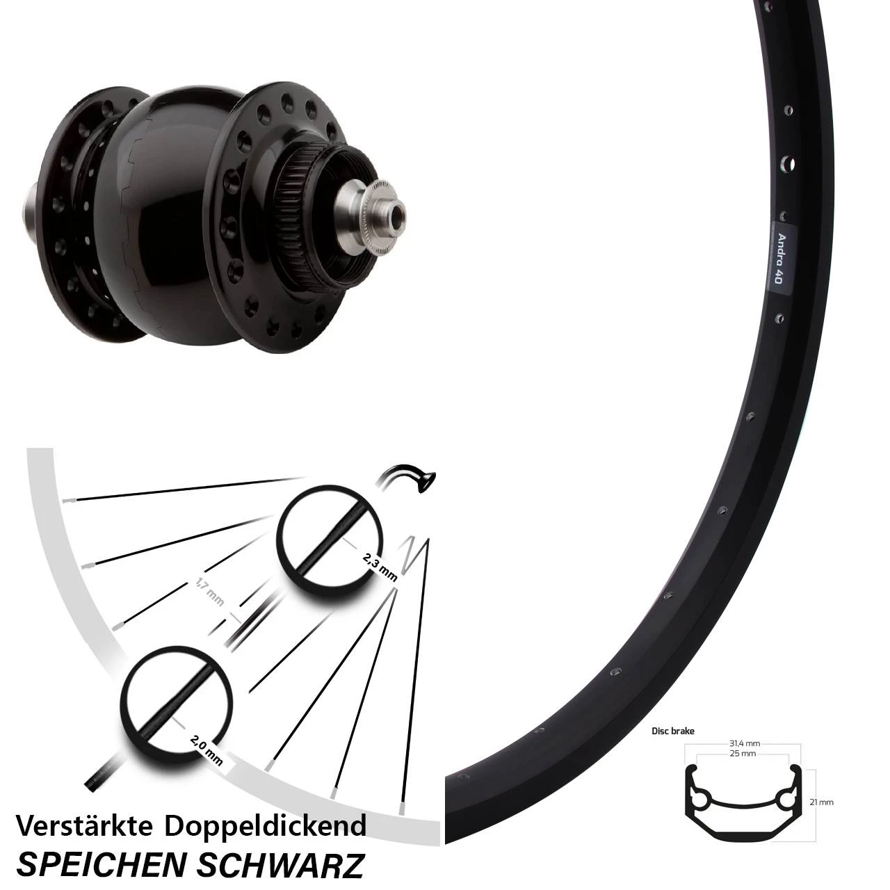 Technische Daten Vorderrad Ryde Andra 40 Disc schwarz & Nabendynamo SON 28 Disc Centerlock Hohlachse schwarz eloxiert