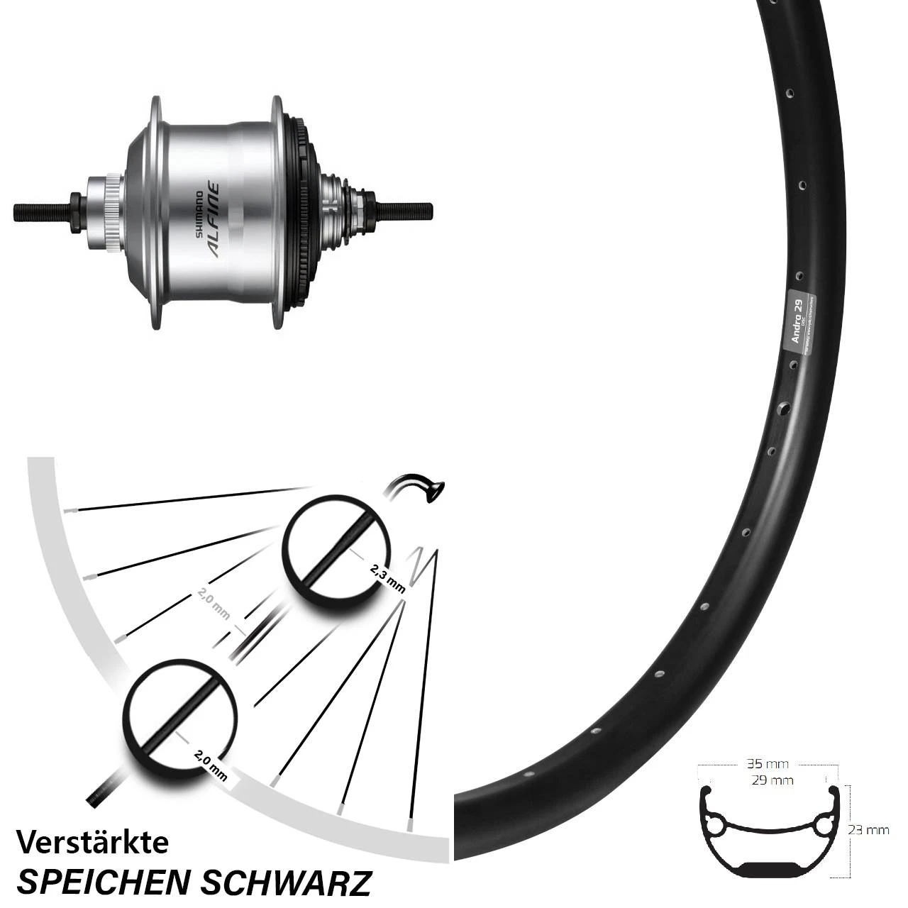 24 Zoll Ryde Andra 29 Disc Hinterrad Shimano 11-Gang Alfine mit verstÀrkten Speichen
