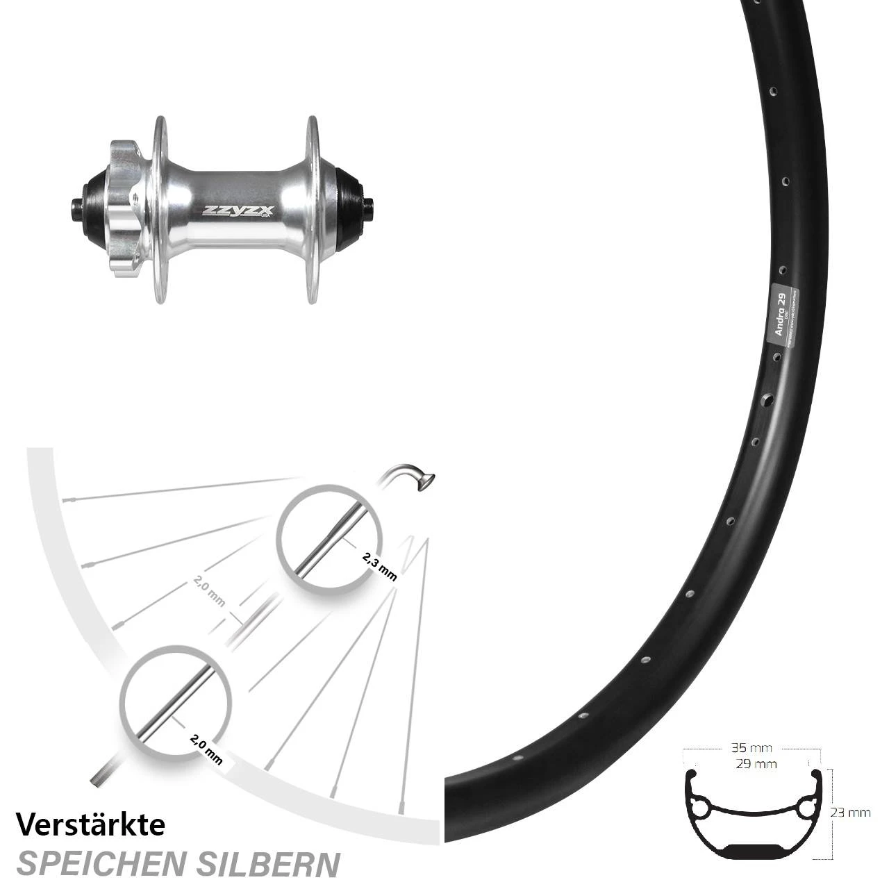 Das hier angebotene 24 Zoll Vorderrad bietet eine ETRTO Größe von 29-507 mm, 100 mm Einbaubreite und eine Ventillochbohrung von 8,5 mm. Es kann an Ihrem eingesetzt werden und ist passend zu Fahrrädern mit 6-Loch Scheibenbremsen im Bereich. Die silberne Formula ZZYZX DC-61 silbern Nabe und die schwarze Ryde Andra 29 Disc schwarz Felge sorgen bei dem vorderen Laufrad für Stabilität. Es kann mit einem maximalen Systemgewicht von bis zu 180 kg belastet werden. Sie erhalten das zuverlässige Bauteil in unserem Onlineshop mit 36 silbernen Speichen. Damit sind Sie gut ausgestattet, um Fahrten auf ebenen Strecken und auch im unasphaltiertem Gelände sicher biken zu können!