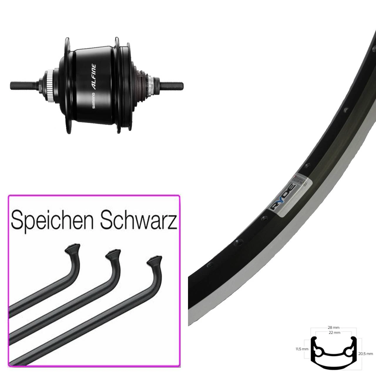 26 Zoll Ryde Andra 35 Hinterrad Shimano Alfine 8-Gang schwarz mit verstÀrkten Speichen