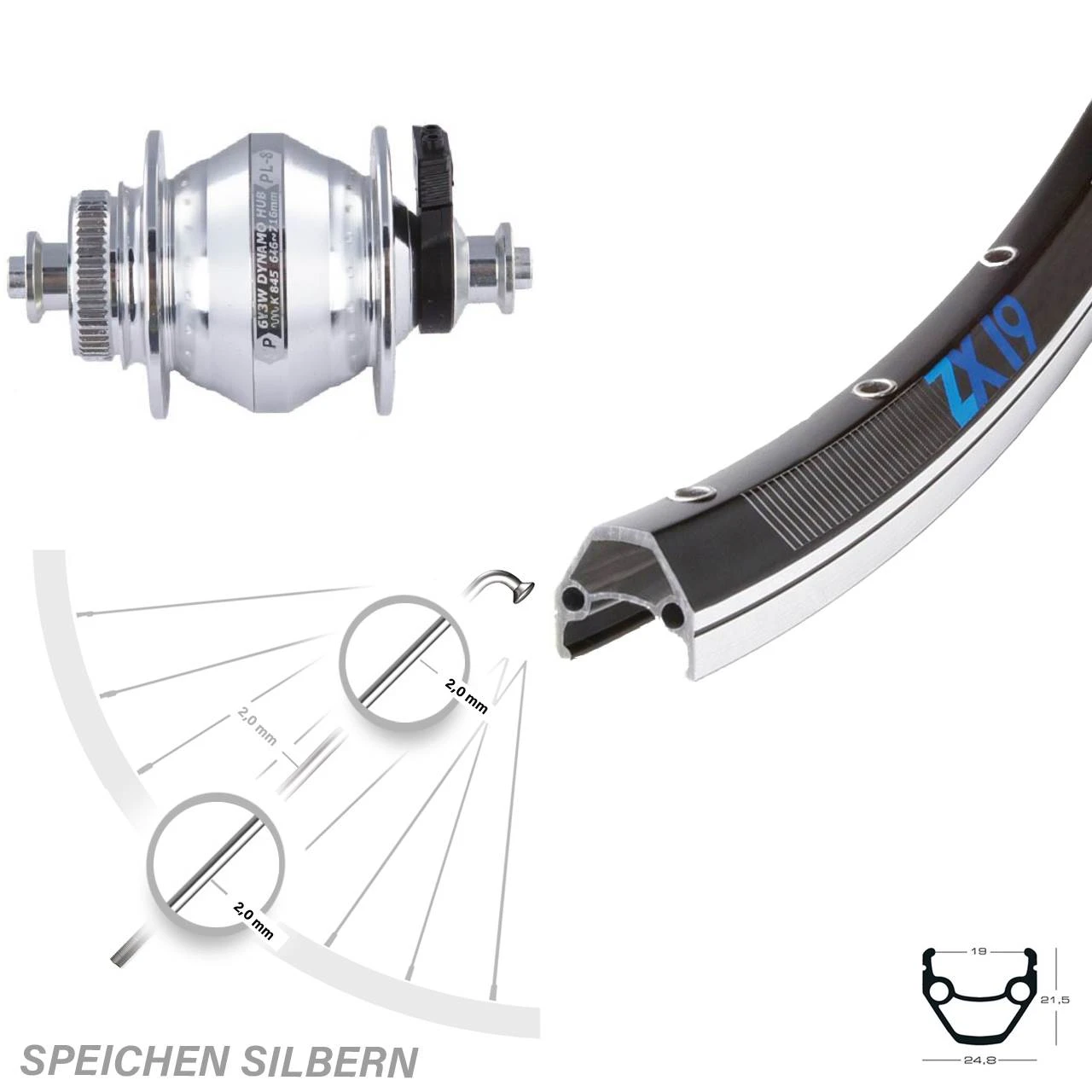 Technische Daten vorderes Laufrad Exal ZX19 schwarz & Nabendynamo Shutter Precision PL-8 Disc Centerlock silbern