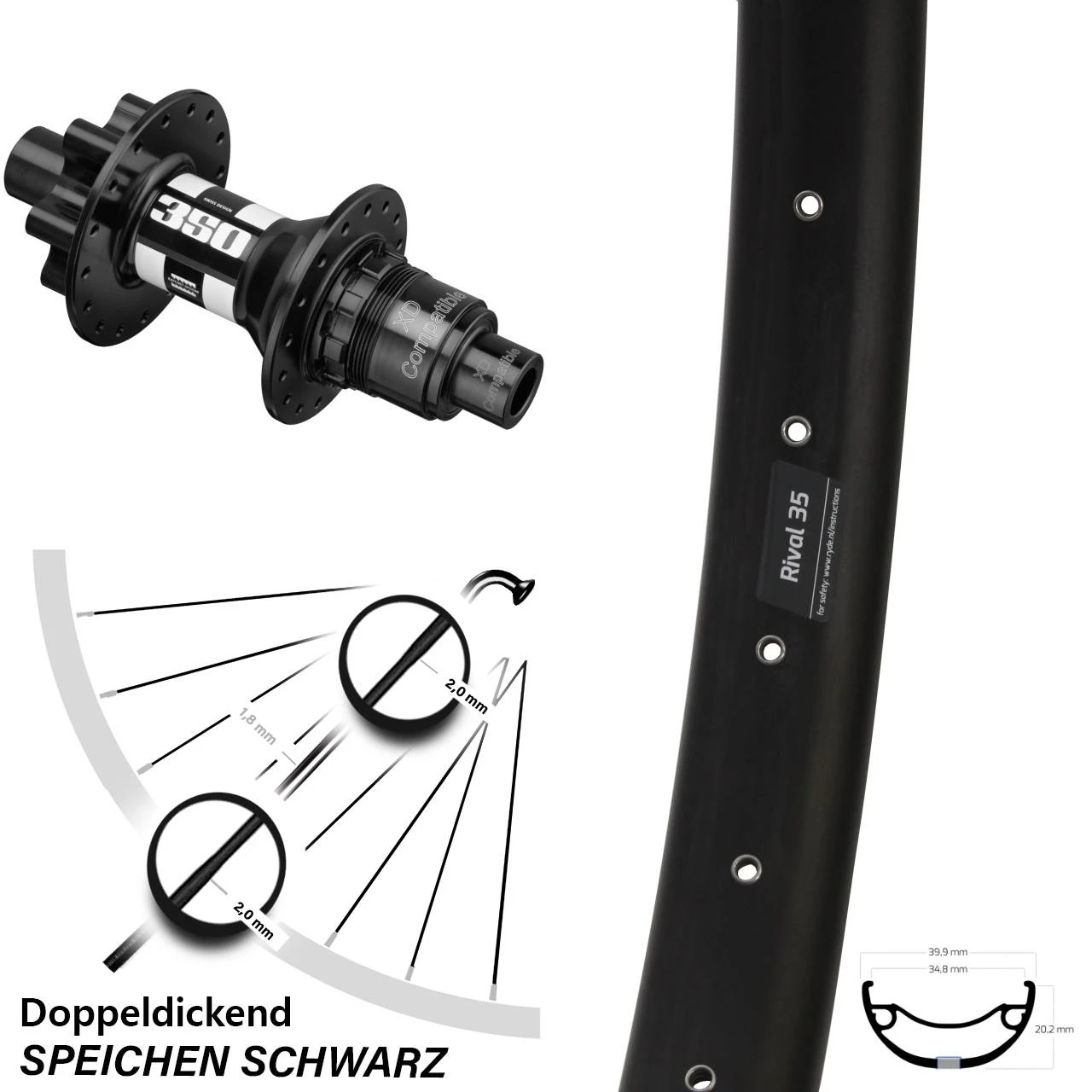 Technische Daten Hinterrad Ryde Rival 35 Disc schwarz und Nabe DT Swiss 350 Boost Disc 6-Loch SRAM XD 12/148