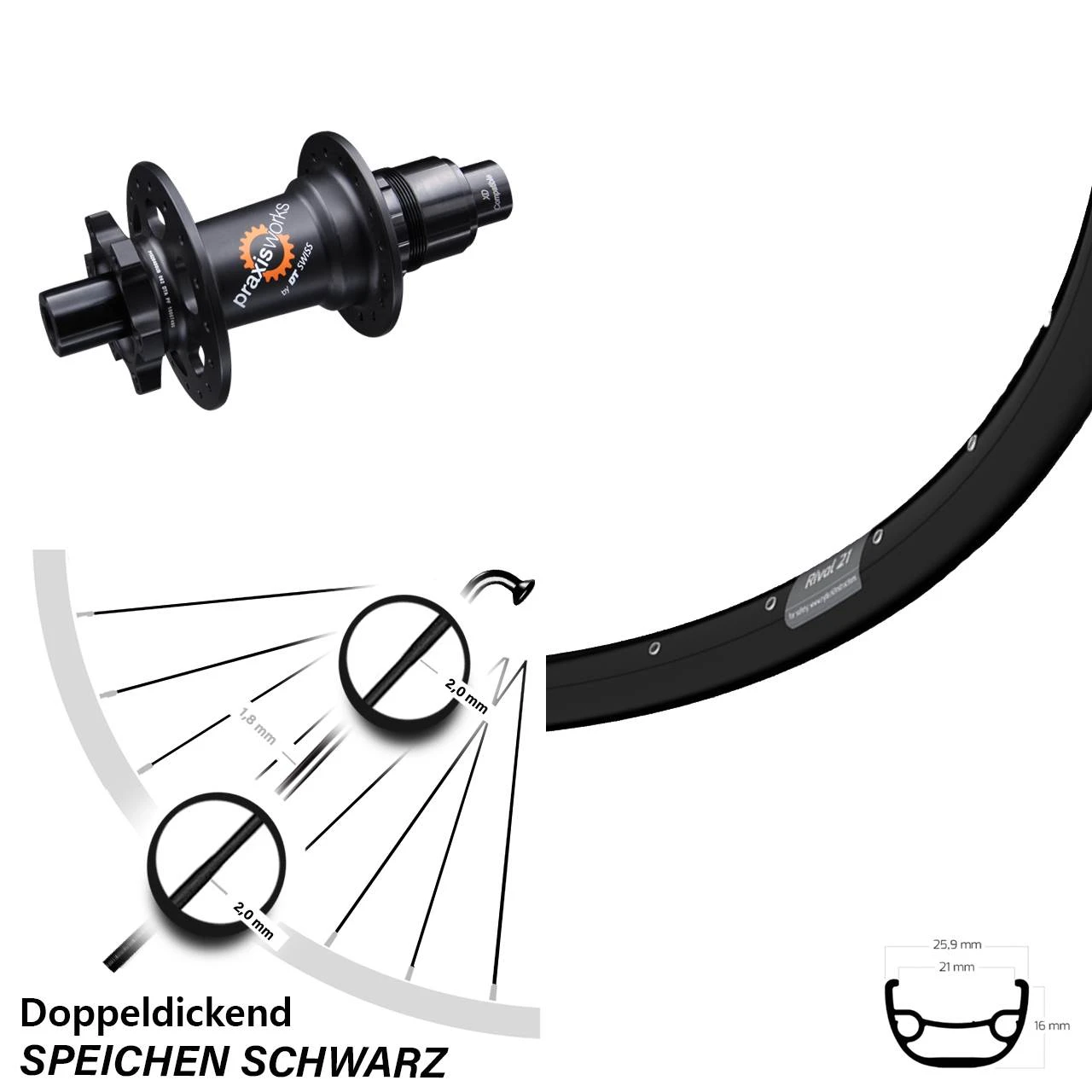 Dieses stabile hintere Laufrad fĂŒr Kettenschaltungen mit einer Ryde Rival 21 Disc schwarz Felge, einer schwarzen DT Swiss 350 SL Disc 6-Loch SRAM XD 12/142 Nabe und 32 Speichen hat eine GröĂe von 27,5 Zoll. Die ETRTO GröĂe betrĂ€gt 21-584 mm und die Einbaubreite liegt bei 142 mm. Die gesteckte Felge hat eine Ventillochbohrung von 6,5 mm (darf auf 8,5 mm aufgebohrt werden) und das Systemgewicht des soliden Laufrades betrĂ€gt maximal 120 kg. Ob auf unbefestigtem Untergrund im GelĂ€nde oder auf asphaltierten StraĂen: Mit diesem Bauteil sind Sie besonder im Mountainbike / MTB Bereich jederzeit sicher, bequem und mit ausreichend Halt unterwegs! Das Hinterrad ist speziell auf RĂ€dern mit 6-Loch Scheibenbremsen ausgelegt.