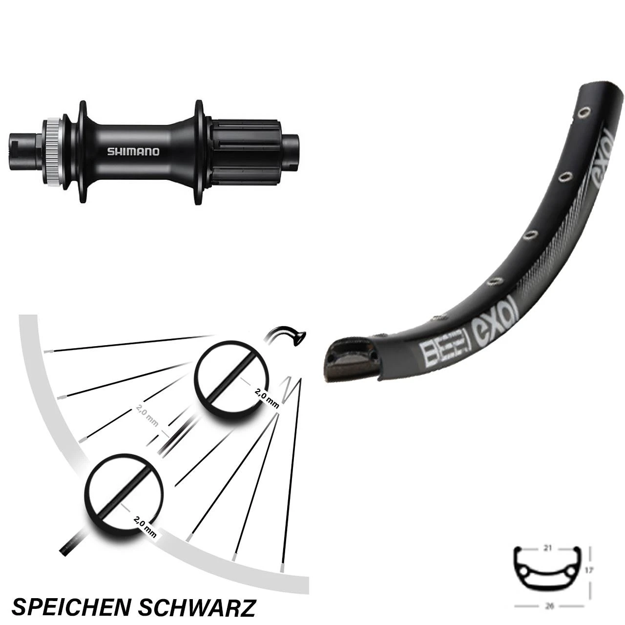 Technische Daten Hinterrad Exal BE 21 schwarz und Nabe Shimano FH-MT400 schwarz
