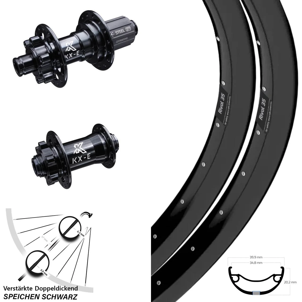Technische Daten 27,5 Zoll Ryde Rival 35 verstÀrkter Laufradsatz KX-E Nabe 6-loch