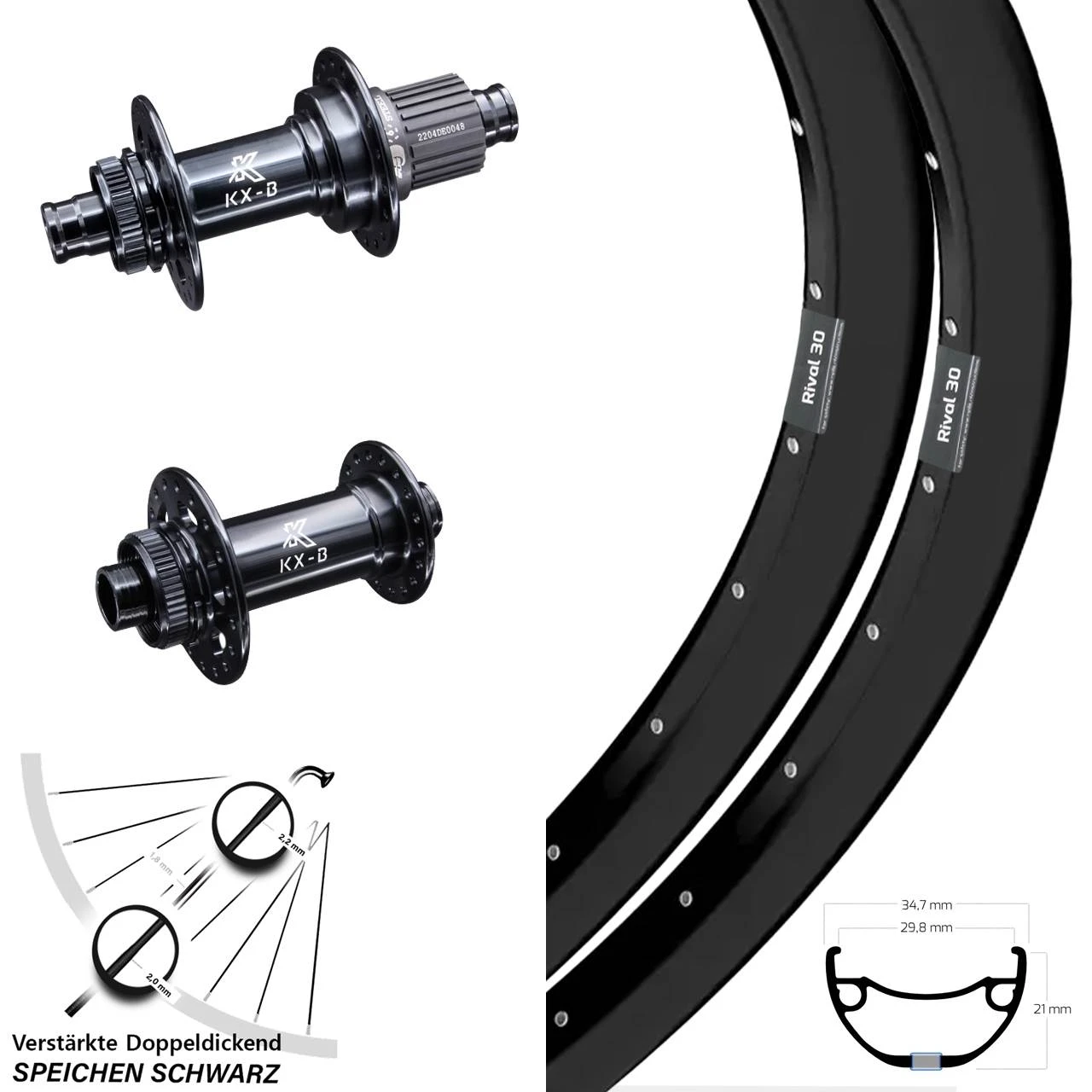 Die strapazierfÀhigen LaufrÀder des beliebten Herstellers Ryde bringen Sie auch nach vielen Jahren zeitnah an ihren Bestimmungsort. Die schwarzen 27,5 Zoll, 27,5+ Zoll Felgen (Vorder- und Hinterrad) sind bei uns im Online Shop im preiswerten Set erhÀltlich. Dieses beinhaltet neben den schwarzen Ryde Rival 30 Disc Felgen auch die passenden schwarzen Fahrradnaben KX-B Boost Hinterradnabe 12/148 Centerlock Stahl Micro Spline, KX-B Boost Vorderradnabe 15/110 Centerlock. Alle Einzelteile unserer Sets sind selbstverstÀndlich farblich und funktional perfekt aufeinander abgestimmt und sind an ihrem Fahrrad sofort einbaubereit.