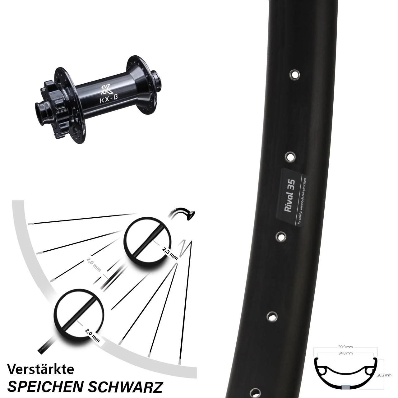 Technische Daten Vorderrad Ryde Rival 35 Disc schwarz mit Nabe KX-B Boost Vorderradnabe 15/110 6-Loch