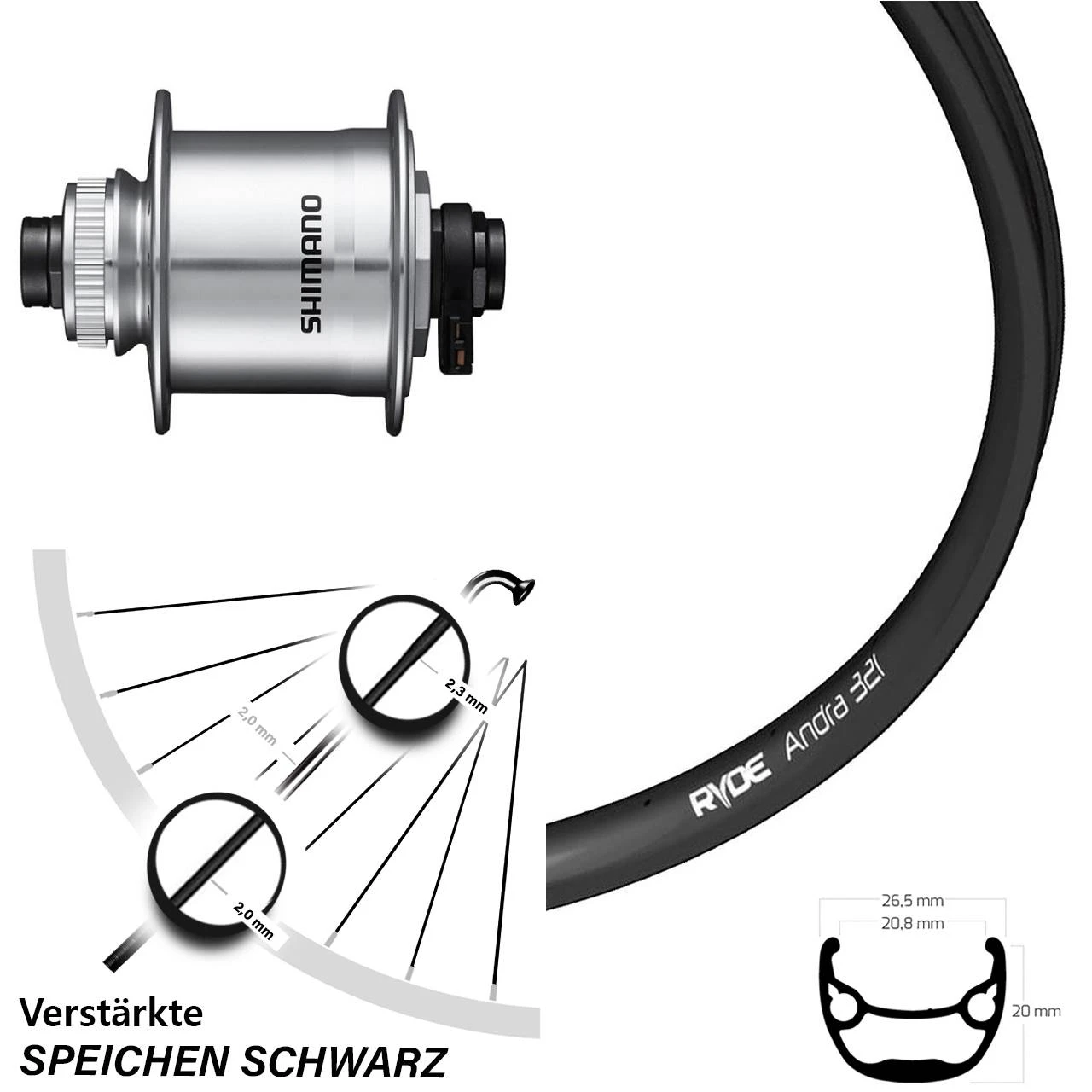 Technische Daten vorderes Laufrad Ryde Andra 321 Disc schwarz & Nabendynamo Shimano DH-UR708-3D silbern