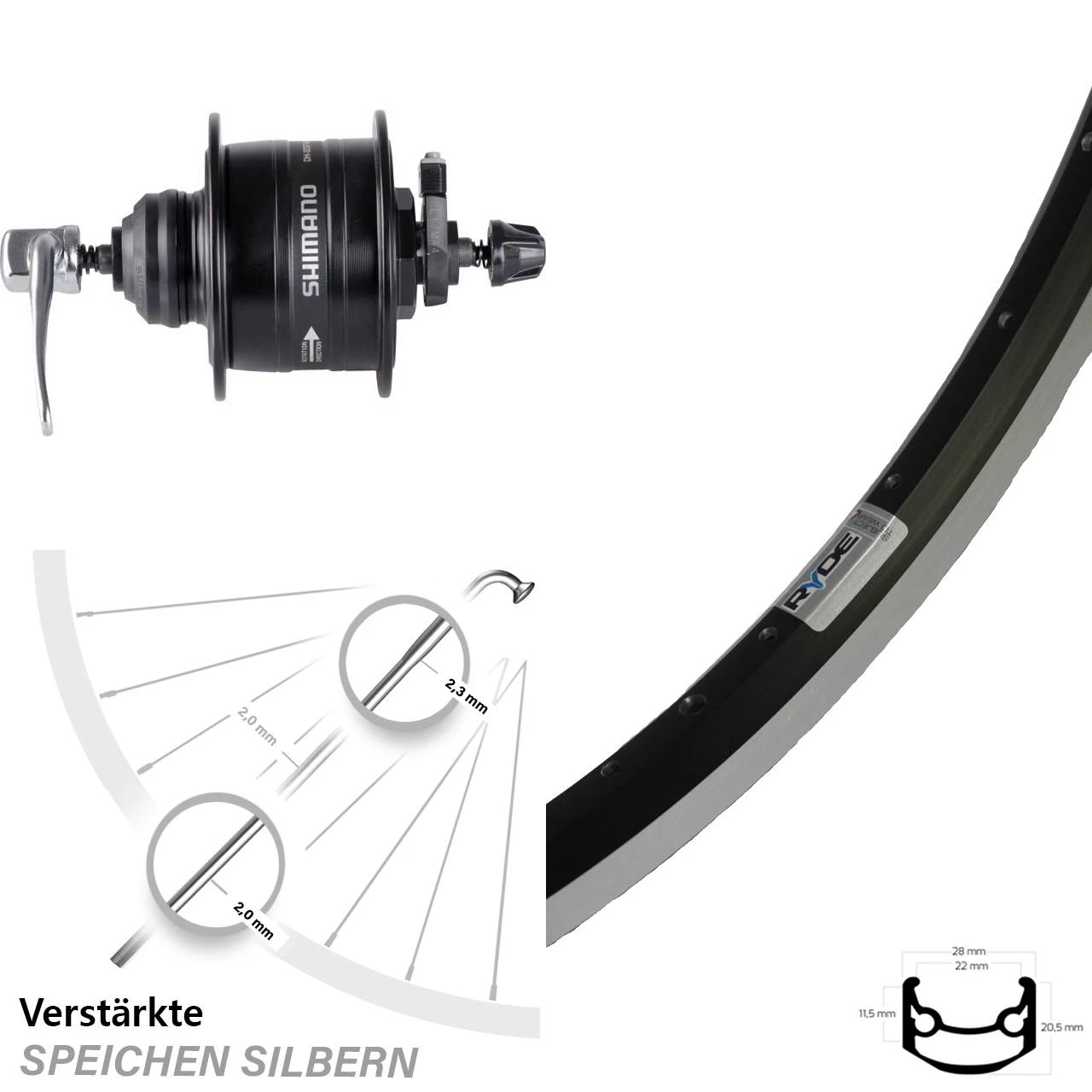 Technische Daten vorderes Laufrad Ryde Andra 35 Felgenbremse schwarz & Nabendynamo Shimano DH-3D37 schwarz