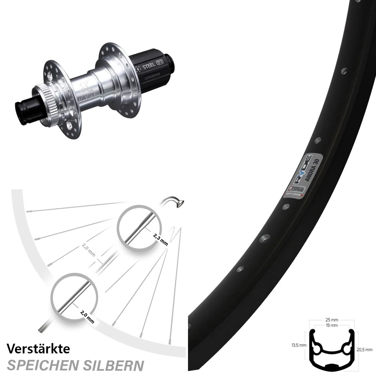 Produktbeschreibung 28-29 Zoll Hinterrad KX-E Nabe silbern-eloxiert 12×142 mm Ryde Andra 30 Disc