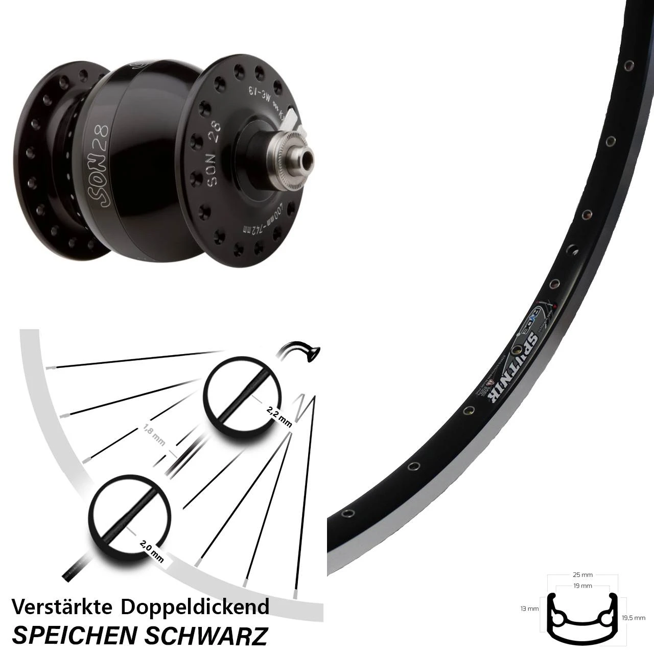 28 Zoll Vorderrad Fahrrad Ryde Sputnik schwarz Son Nabendynamo mit verstÀrkten Doppeldickendspeichen