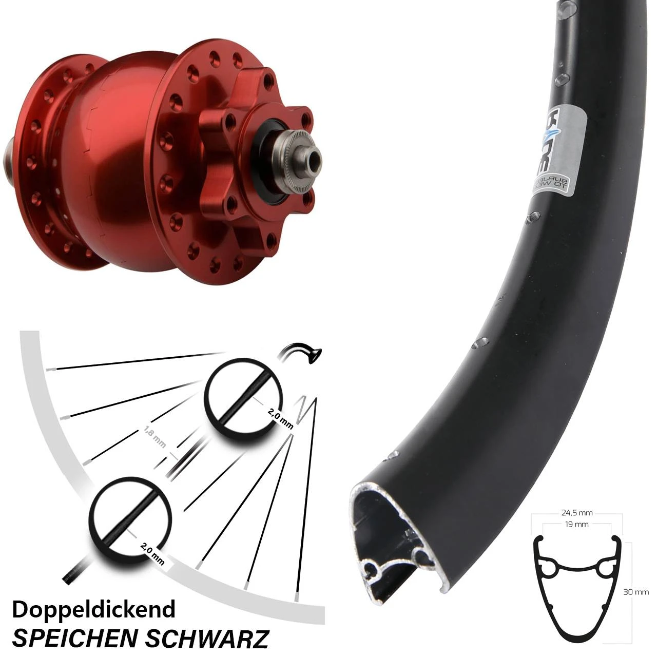 Produktbeschreibung 28 Zoll Vorderrad mit Nabendynamo Ryde Dutch 19 SON 28 rot eloxiert