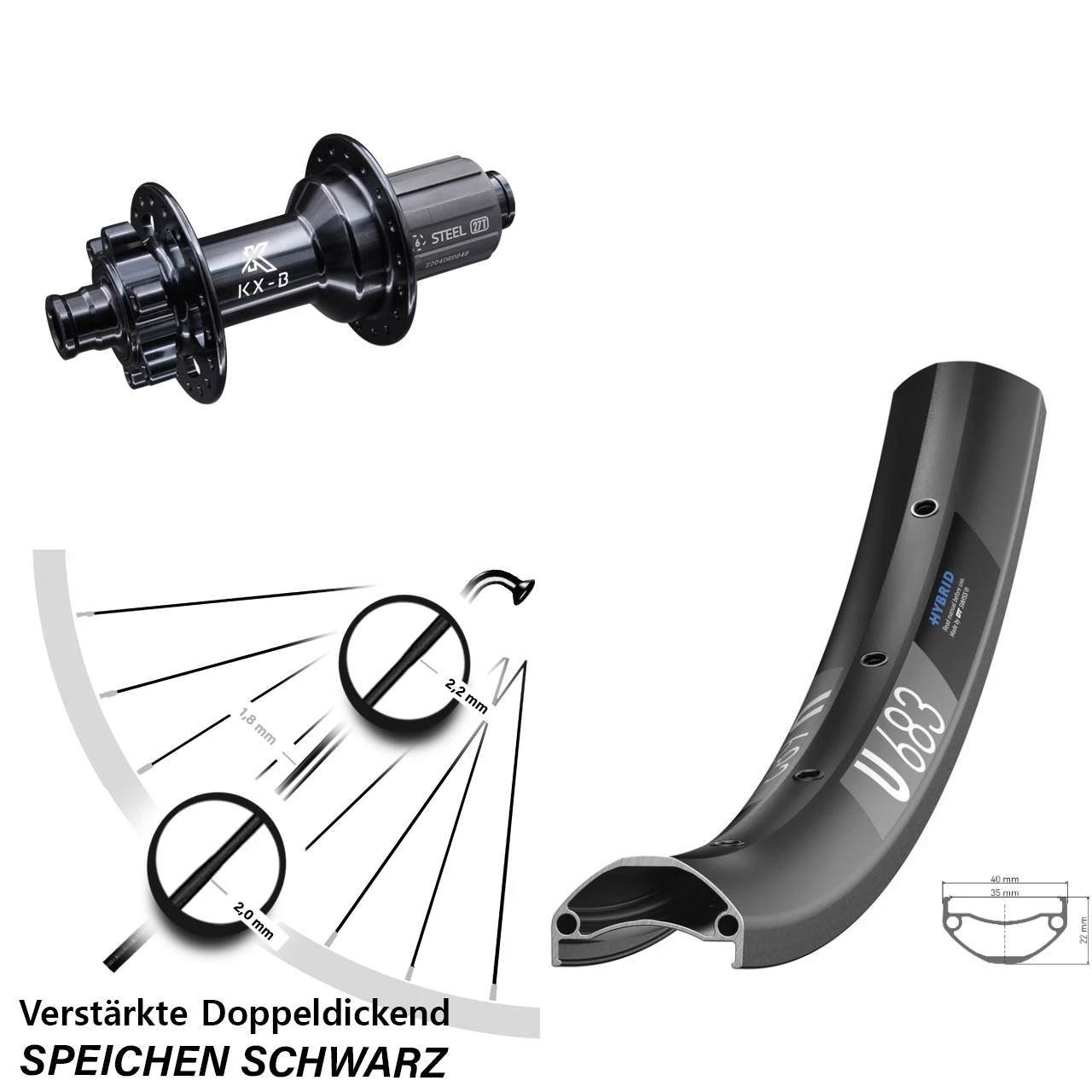 27,5+ Zoll Hinterrad DT Swiss U 683 Disc mit KX-B Nabe 12×148 Boost Heavy Duty mit verstĂ€rkten Doppeldickendspeichen