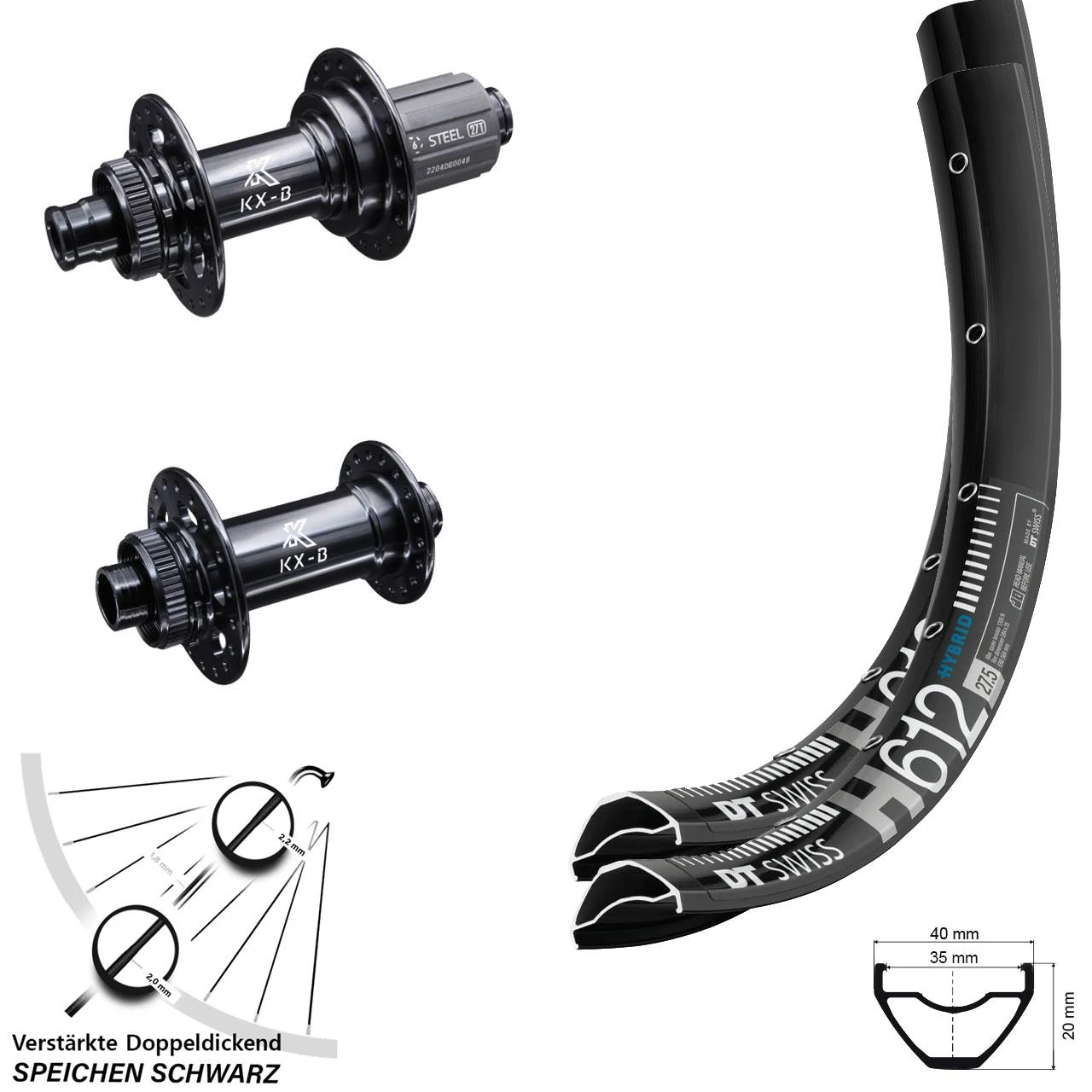 - 1 KX-B 12×148 mm Boost Centerlock DT Swiss H 612 Hinterrad 27,5+ Zoll Shimano 11-fach (Auswahl zwischen Messingnippel schwarz, Messingnippel silbern)