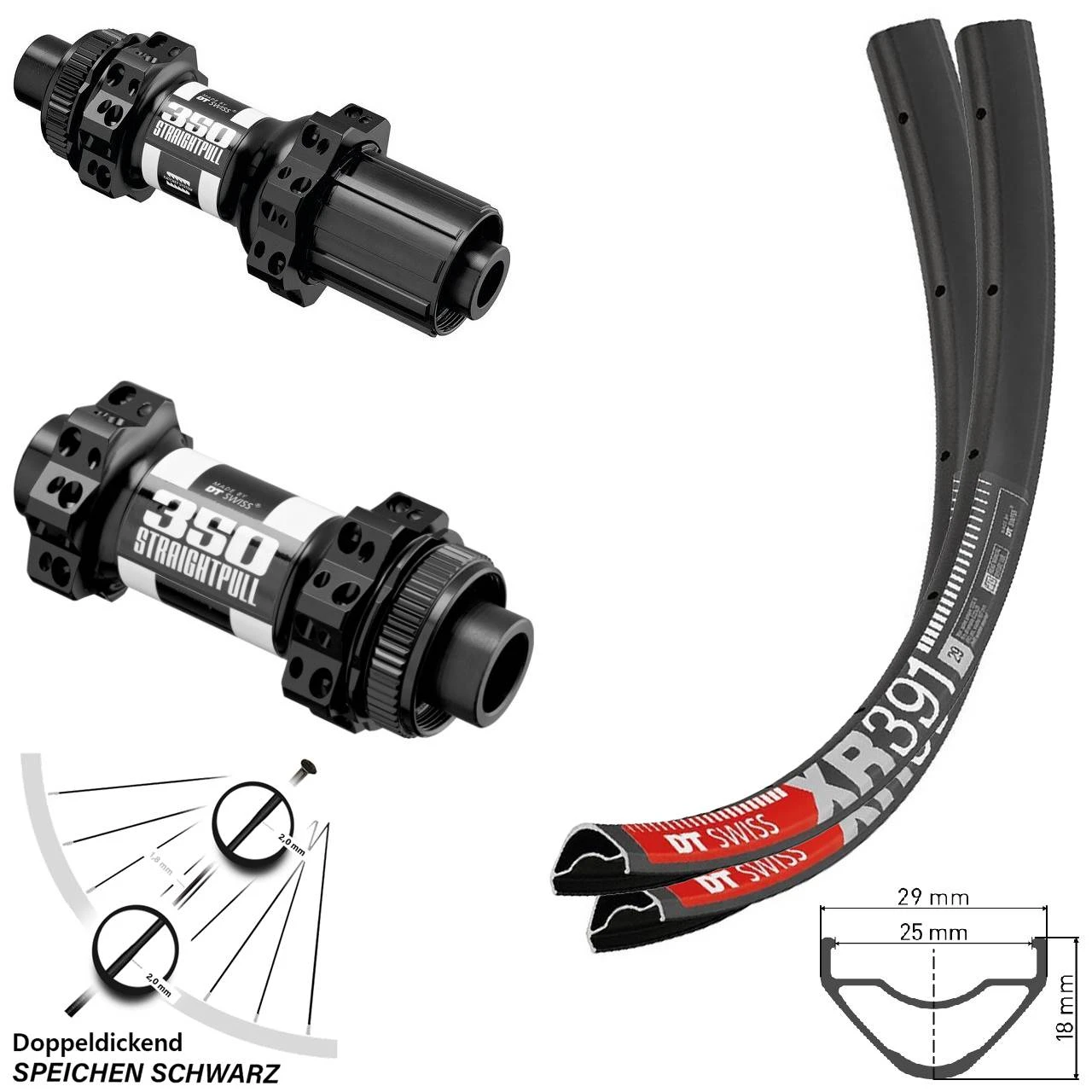 - 1 29 Zoll Hinterrad DT Swiss 350 Straightpull 12×142 Centerlock XR 391 (Auswahl zwischen Messingnippel schwarz, Messingnippel silbern)