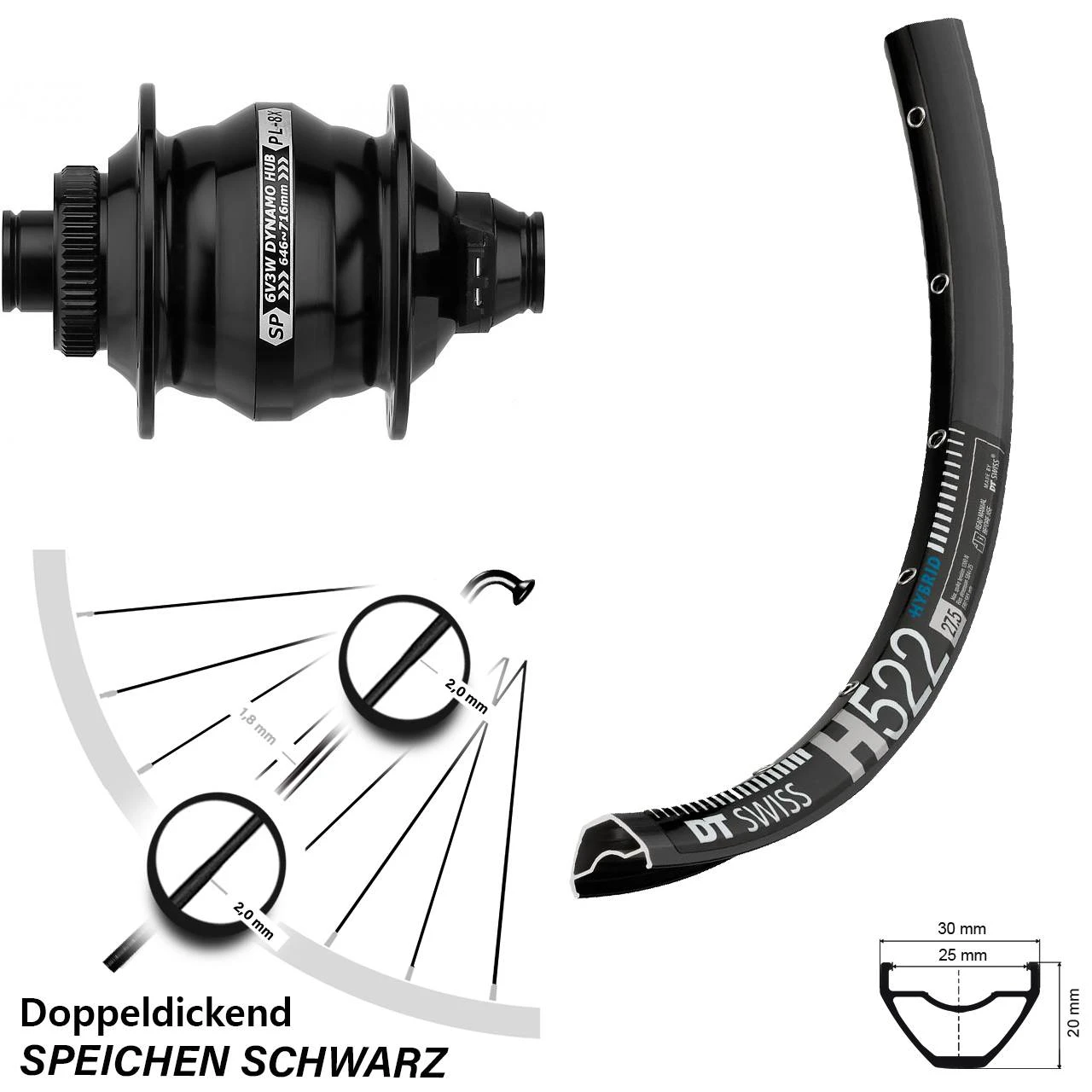 - Vorderrad 27,5 Zoll DT Swiss H 522 schwarz mit Nabendynamo Shutter Precision PL-8X-M schwarz