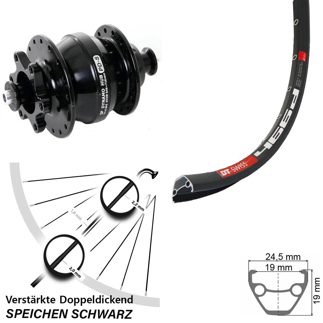 - Vorderrad 27,5 Zoll DT Swiss 466 schwarz mit Nabendynamo Shutter Precision PD-8 schwarz