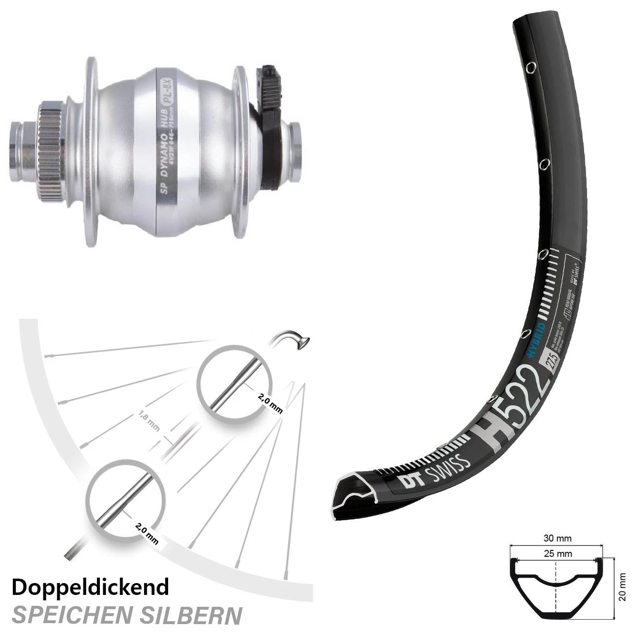 - Vorderrad 27,5 Zoll DT Swiss H 522 schwarz mit Nabendynamo Shutter Precision PL-8X-M silbern