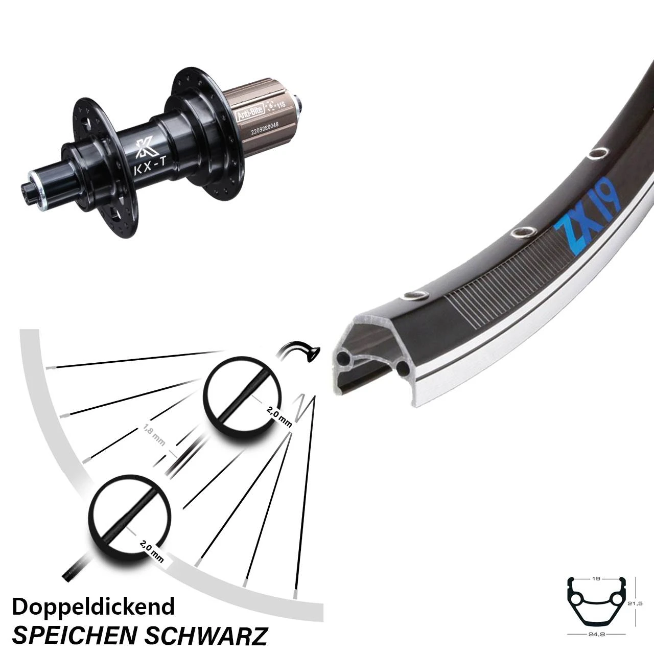 Technische Daten Hinterrad Exal ZX19 schwarz doppelt geöst und Nabe KX-T Hinterradnabe 5/135 Felgenbremse schwarz
