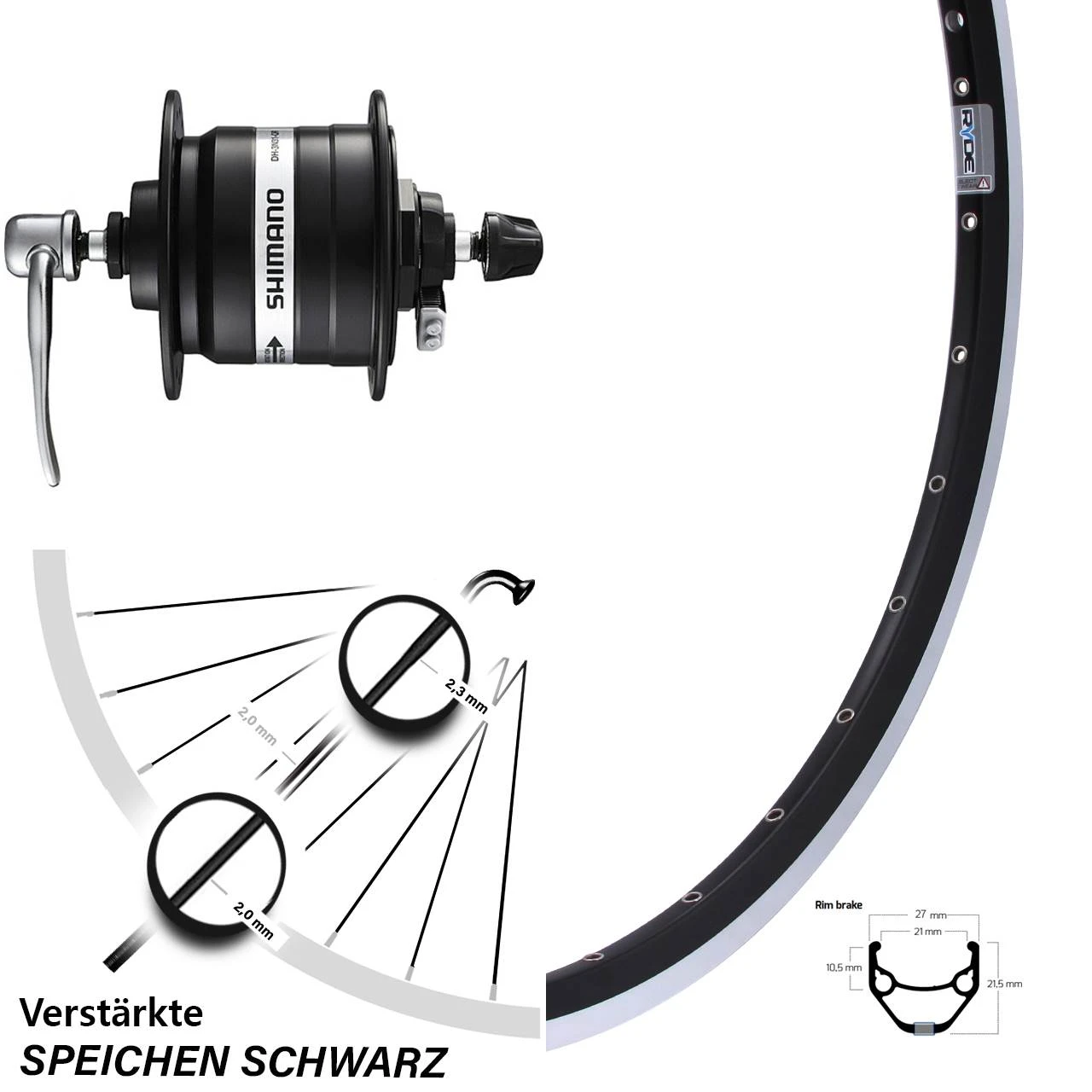 Technische Daten vorderes Laufrad Ryde ZAC 421 Felgenbremse schwarz & Nabendynamo Shimano DH-3N31-QR schwarz
