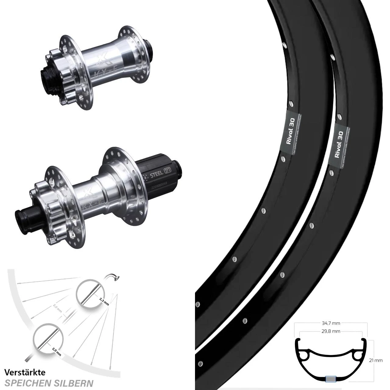 Laufradsatz 27,5 Zoll KX-E silbern verstĂ€rkt 142×100 Ryde Rival 30 mit verstĂ€rkten Speichen
