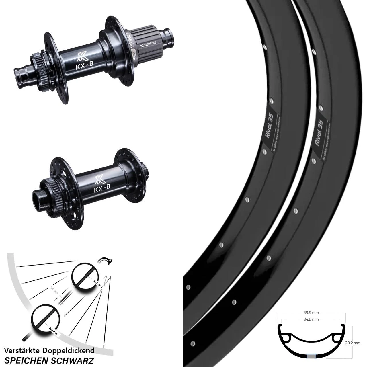 GenieĂen Sie die Annehmlichkeiten unserer durchdachten Bike-LaufradsĂ€tze! Funktional und optisch optimal zusammengestellt bieten unsere Laufrad-Komplett-Sets ein hohes MaĂ an StabilitĂ€t. Die 29 Zoll, 29+ Zoll Felgen Ryde Rival 35 Disc kommen aus dem Hause Ryde und verfĂŒgen ĂŒber eine solide Verarbeitung und eine bestĂ€ndige Laufleistung. Passend dazu liefern wir Ihnen die belastbaren schwarzen Naben KX-B Boost Hinterradnabe 12/148 Centerlock Stahl Micro Spline, KX-B Boost Vorderradnabe 15/110 Centerlock. 36 mit einer StĂ€rke von 2,2-1,8-2,0 mm Edelstahl sorgen fĂŒr eine hervorragende ZuverlĂ€ssigkeit. Dieses harmonisch Laufrad-Set ist fĂŒr Bikes mit Scheibenbremse geeignet. Alle LaufrĂ€der aus unserem Shop werden bereits komplett eingespeicht und zentriert an Sie ausgeliefert und sind an ihrem Bike sofort einbaubereit.
