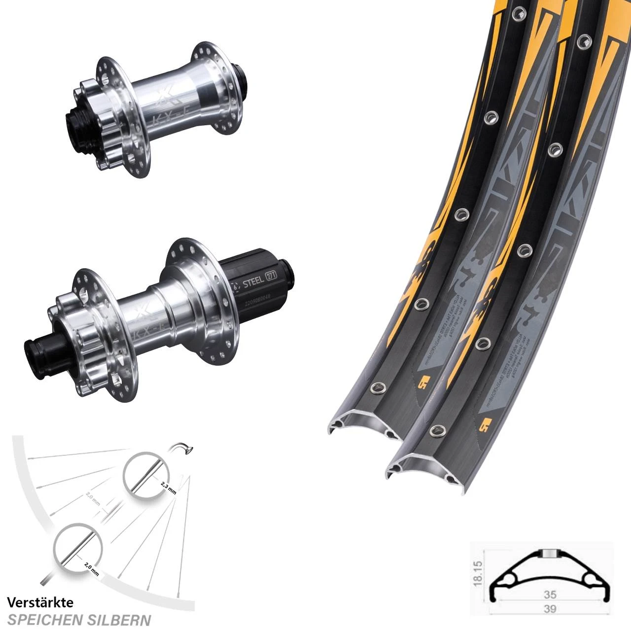 Genießen Sie die Annehmlichkeiten unserer ausgereiften Fahrrad-Laufradsätze! Technisch und optisch bestens zusammengestellt bieten unsere Laufrad-Komplett-Sets ein hohes Maß an Langlebigkeit. Die 27,5 Zoll, 27,5+ Zoll Felgen Rodi TRYP 35 kommen aus dem Hause und verfügen über eine solide Verarbeitung und eine beständige Laufleistung. Passend dazu liefern wir Ihnen die lauffreudigen silberfarbenen Naben KX-E Hinterradnabe 6-Loch 12/142 Shimano 11-fach silbern, KX-E Vorderradnabe 6-Loch 15/100 silbern. 32 mit einer Stärke von 2,34/2,0 mm Edelstahl verstärkt sorgen für eine hervorragende Stabilität. Dieses solide Laufrad-Set ist für Fahrräder mit Scheibenbremse geeignet. Alle Laufräder aus unserem Online Shop werden bereits komplett eingespeicht und zentriert an Sie ausgeliefert und lassen kaum Wünsche offen.