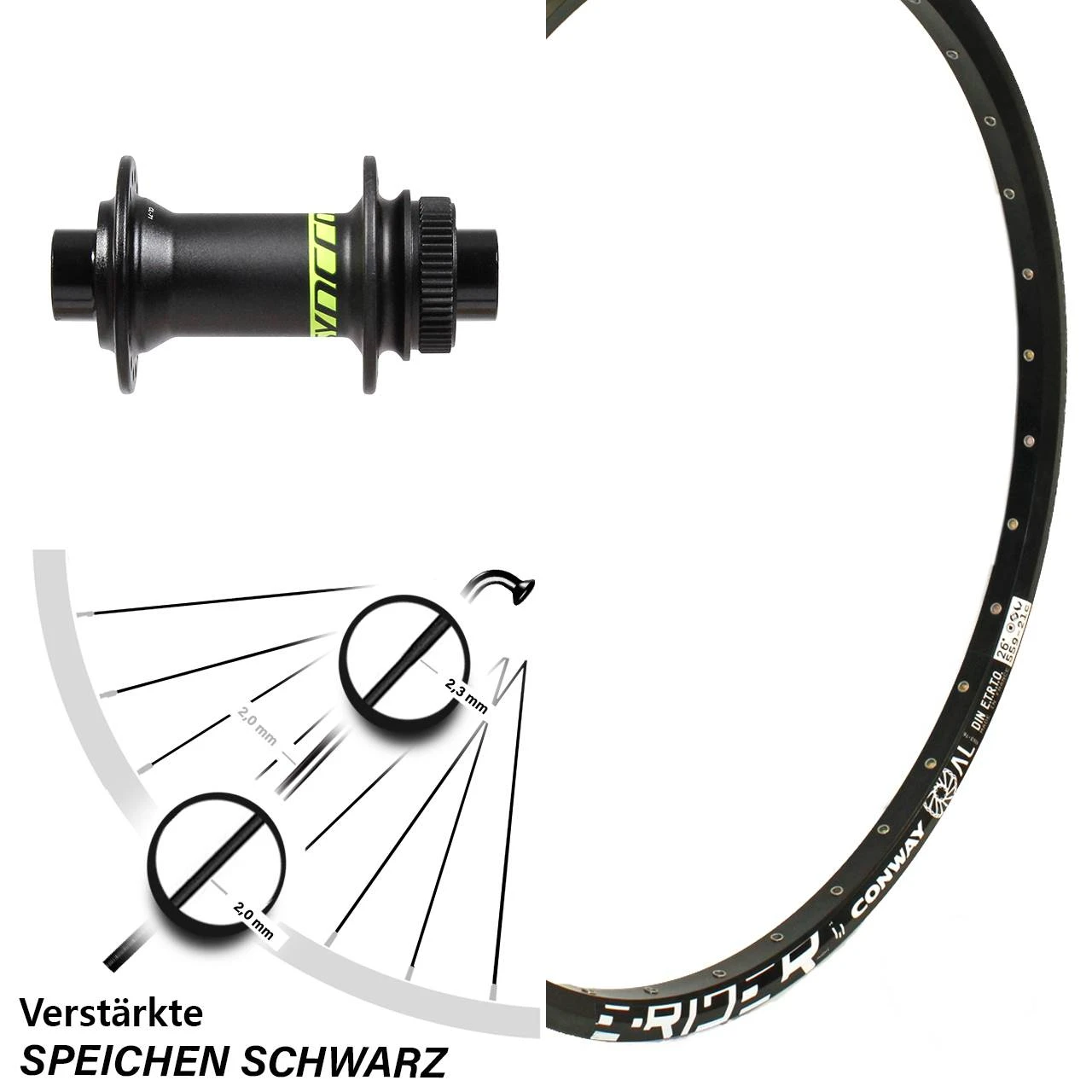 Das 26 Zoll Zoll groĂe Vorderrad verfĂŒgt ĂŒber 100 mm Einbaubreite, eine ETRTO GröĂe von 21-559 mm und wird im Lastenrad, E-Bike bis 25 km/h Bereich verbaut. Sein maximal zugelassenes Systemgewicht liegt bei bis zu 150 kg. Die verbaute schwarze Mach 1 Magma Disc Felge hat eine Ventillochbohrung von 8,5 mm. Die schwarze Syncros CL-71 15×100 grĂŒn Formula Nabe unterstĂŒtzt den stabilen Ausbau des Laufrads. Somit sind Sie auf ebenen, aber auch auf unbefestigten,unasphaltierten UntergrĂŒnden im GelĂ€nde bestens aufgestellt. Es ist speziell auf Bikes mit Centerlock Scheibenbremsen ausgelegt und kann bei uns mit 32 schwarzen Speichen bestellt werden, um Ihr Rad ideal fĂŒr den Lastenrad, E-Bike bis 25 km/h Bereich auszustatten!