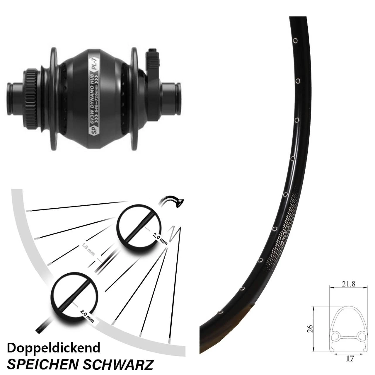 Nabendynamo Exal GR 17 schwarz Scheibenbrems- Gravel-Laufrad SP PL7 28 Zoll mit Doppeldickendspeichen