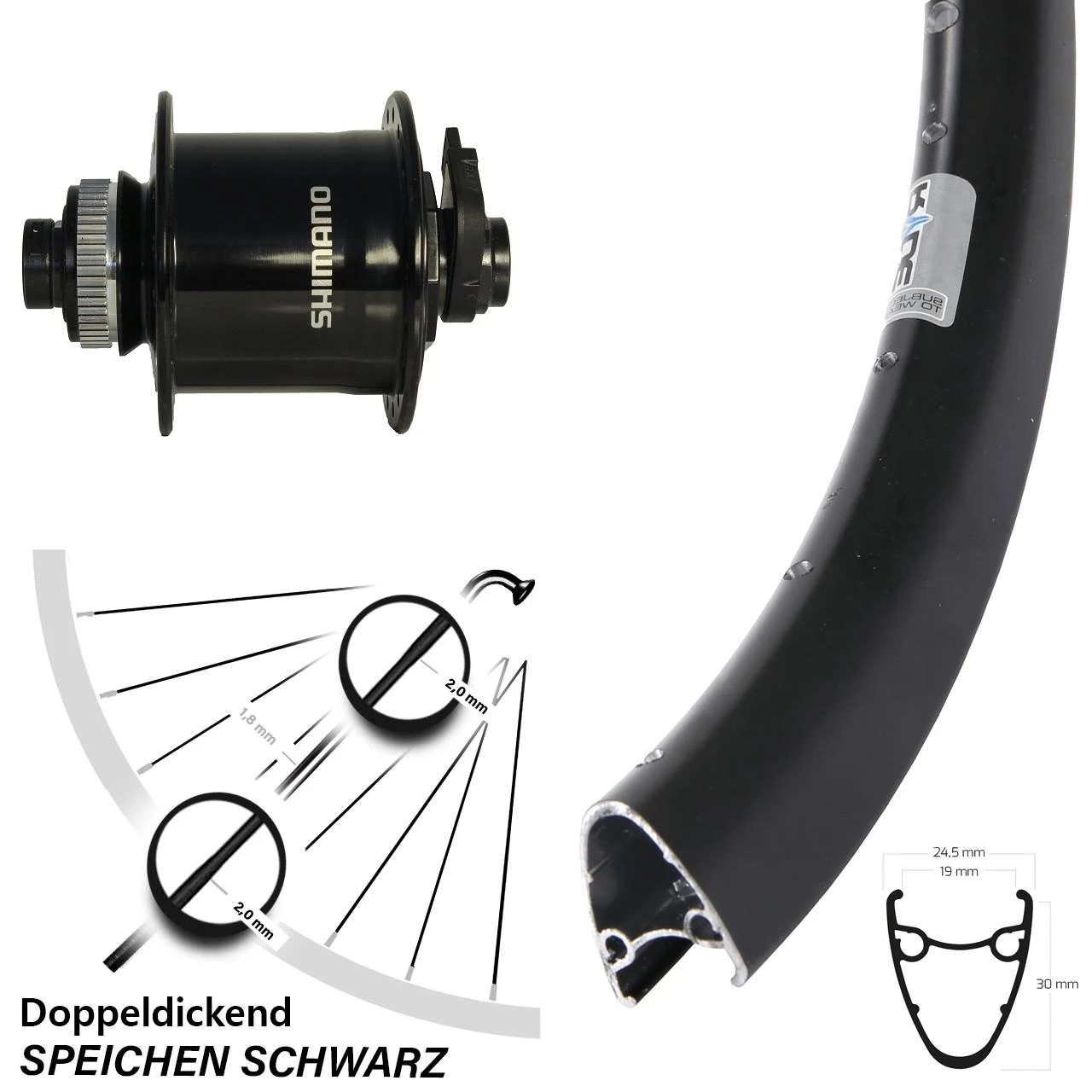Mit der in schwarz gehaltenen Felge (Modell: Ryde Dutch 19 Disc schwarz) hat der Hersteller Ryde ein Fahrrad-Vorderrad auf den Markt gebracht, welches durch schwarze Speichen und einen leichtlĂ€ufigen Shimano Nabendynamo, fĂŒr 12 mm Steckachse besticht. Nabendynamos sind leise und sehr zuverlĂ€ssig, da sie direkt in der Nabe des Vorderrades verbaut sind. Die Speichenanzahl betrĂ€gt 32. Dieses Komplett-Vorderrad mit 28 Zoll, 29 Zoll ist kompatibel mit allen gĂ€ngigen FahrrĂ€dern mit und ist bereits komplett eingespeicht und zentriert.
