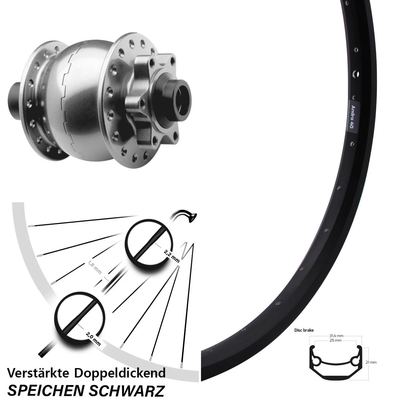 Technische Daten Vorderrad Ryde Andra 40 Disc schwarz & Nabendynamo SON 28-15 Disc 6-Loch Steckachse silbern eloxiert