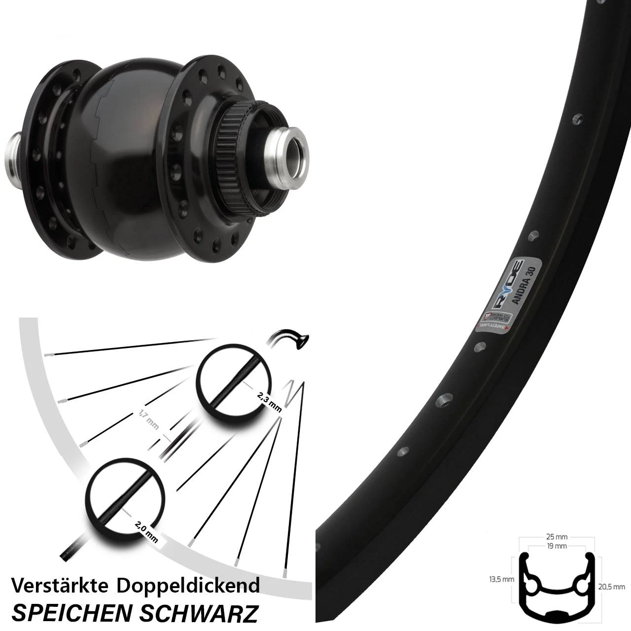 FĂŒr alle FahrrĂ€der, die mit einer ausgestattet sind, ist dieses robuste Fahrrad-Vorderrad (Modell: Ryde Andra 30 Disc schwarz) optimal. Das 28 Zoll, 29 Zoll groĂe Ryde Vorderrad in Verbindung mit dem widerstandsfĂ€higen SON Nabendynamo, fĂŒr 12 mm Steckachse besitzt eine Einbaubreite von 100 mm. Das Vorderrad ist schwarz, der Nabendynamo ist in der Farbe schwarz gehalten und die schwarzen 32 Speichen besitzen eine StĂ€rke von 2,3-1,7-2,0 mm Edelstahl.