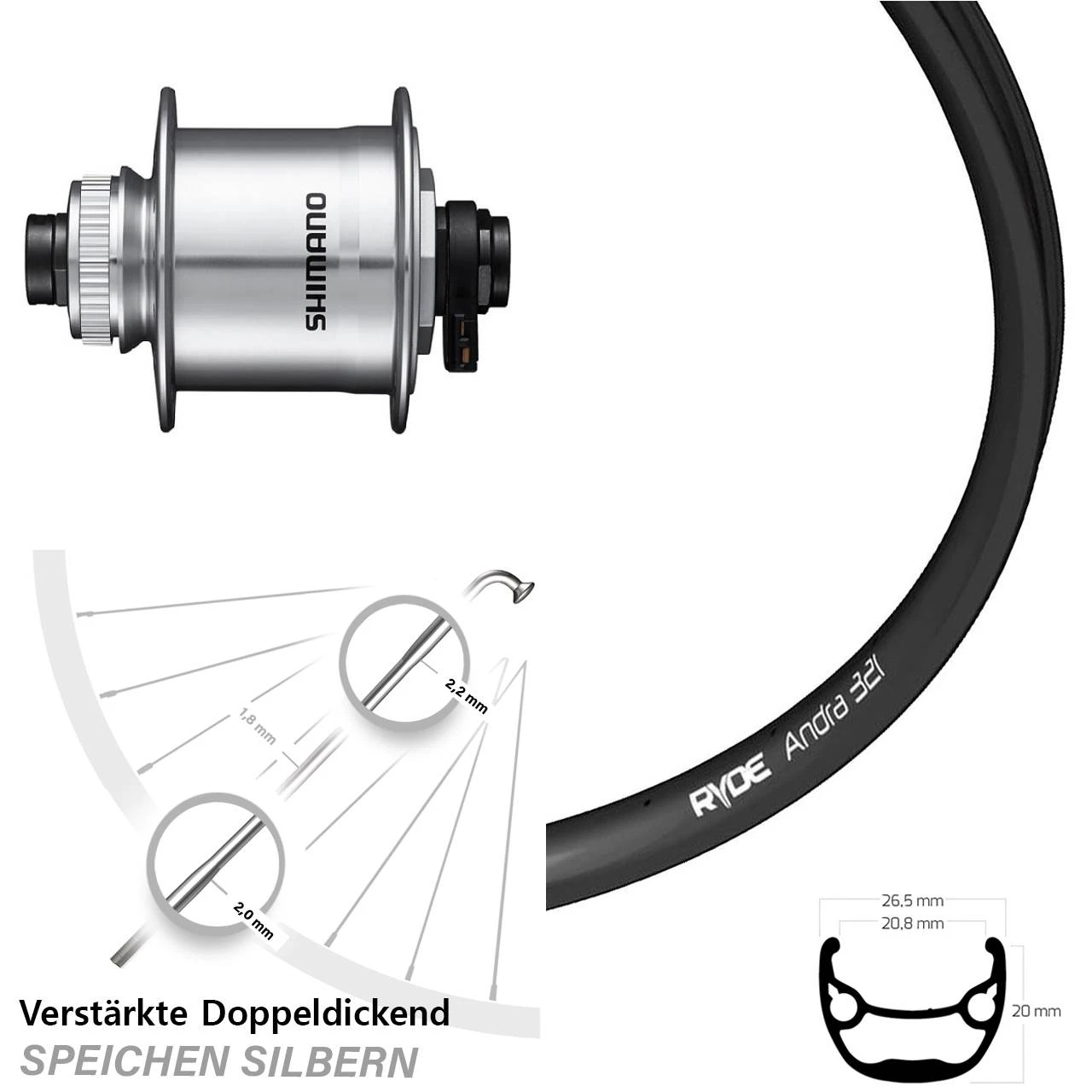 Nabendynamolaufrad Shimano DH-UR705-3D Ryde Andra 321 28 Zolll Centerlock Steckachse mit verstÀrkten Doppeldickendspeichen