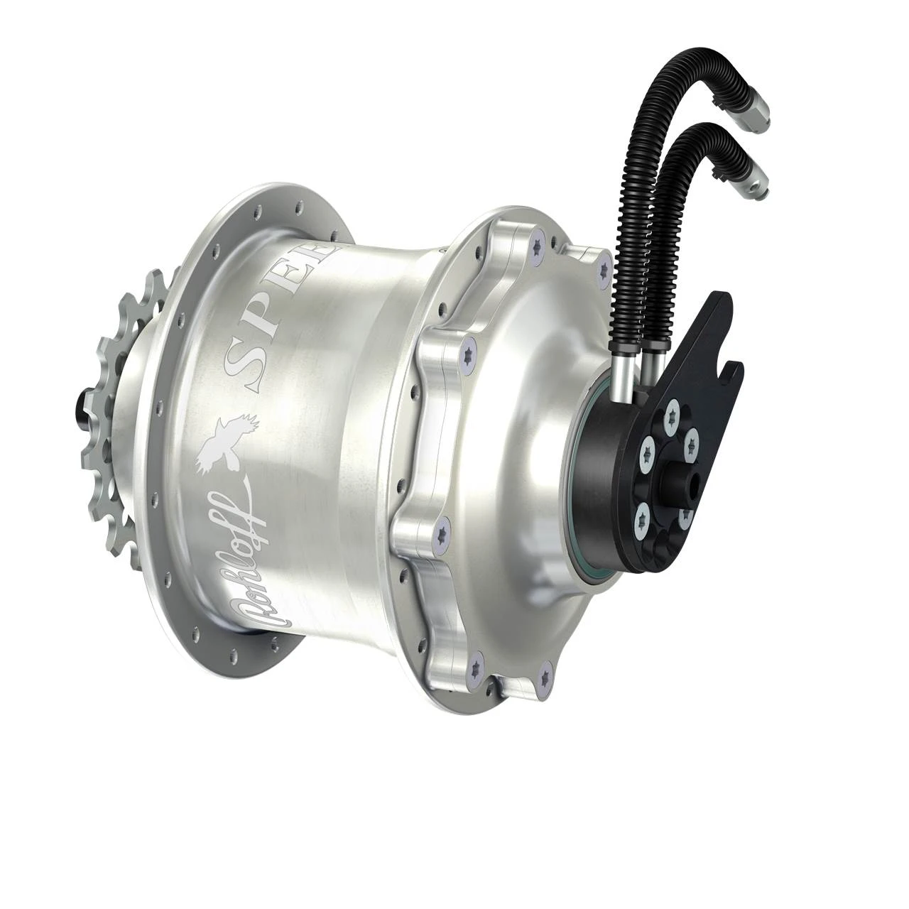Mit der silbernen Speedhub 500/14 CC OEM2 Tandem von dem renommierten deutschen Hersteller Rohloff profitieren Sie von einer unempfindlichen und langlebigen Nabenschaltung für Ihr Mountainbike / MTB, Trekkingbike / Citybike, Lastenrad, E-Bike bis 25 km/h, Crossbike mit einer Felgenbremse. Durch die extra langen Schaltzüge und Schalthüllen kann sie auch an Tandems und Liegerädern gut verwendet werden. Die Aluminiumnabe bietet 135 mm Einbaubreite, eine interne Schaltansteuerung und 14 Gänge. Der Gesamtübersetzungsumfang von 526 Prozent und die eng beieinanderliegenden Schaltstufen ermöglichen eine sehr gute und komfortable Frequenz beim Treten. Da die Technik der Speedhub 500/14 CC OEM2 Tandem Nabe vollständig im Inneren des Gehäuses verbaut ist, ist sie gut vor äußeren Einflüssen wie Wasser, Dreck und Staub geschützt. Die Befestigung kann ganz leicht über einen 5 mm Schnellspanner vorgenommen werden.