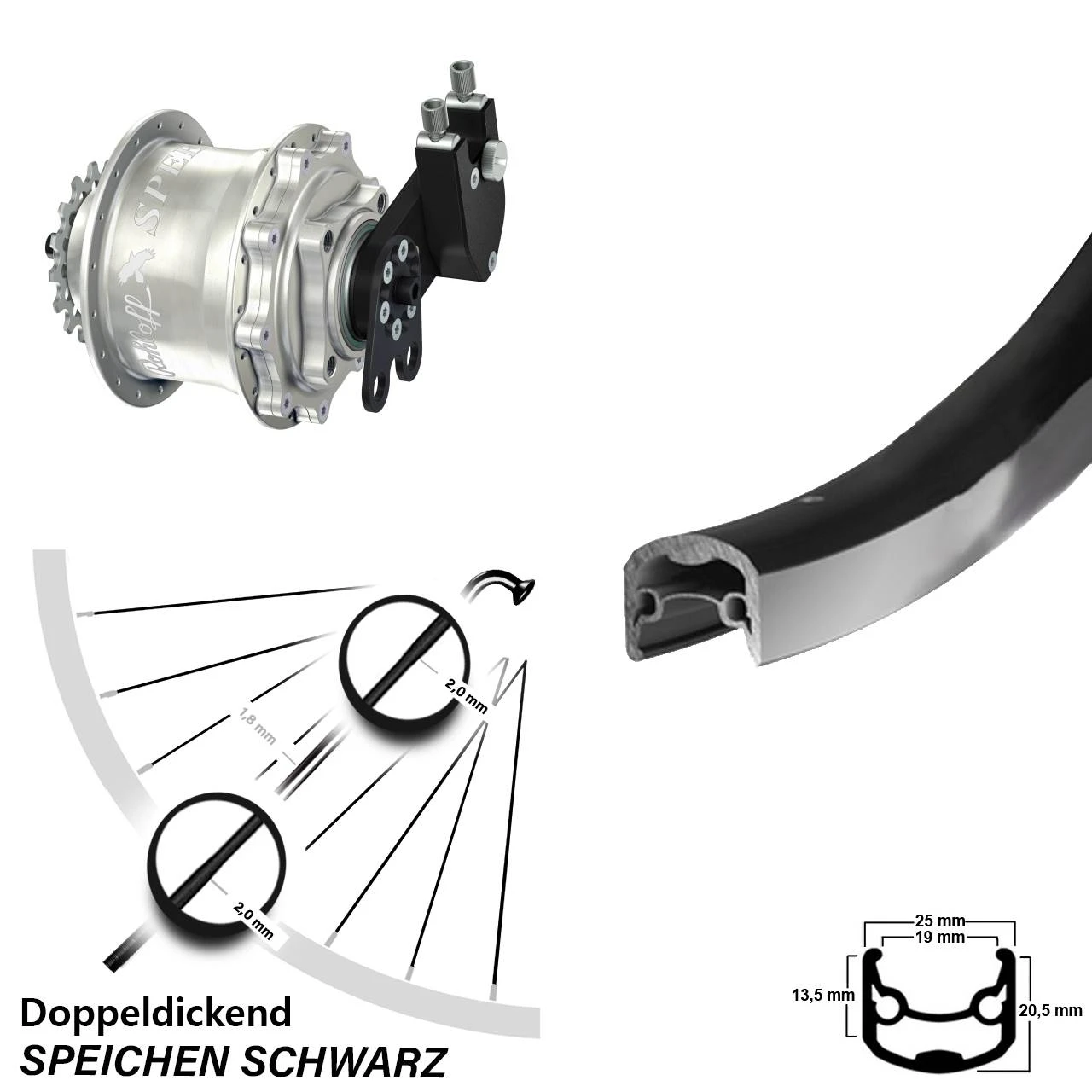 - 36 schwarze Sapim Speichen mit SpeichenstĂ€rke 2,0-1,8-2,0 mm Edelstahl – stabile und gewichtsoptimierte Doppeldickspeiche mit 1,8 mm im Mittelteil und 2,0 mm an den Endbereichen