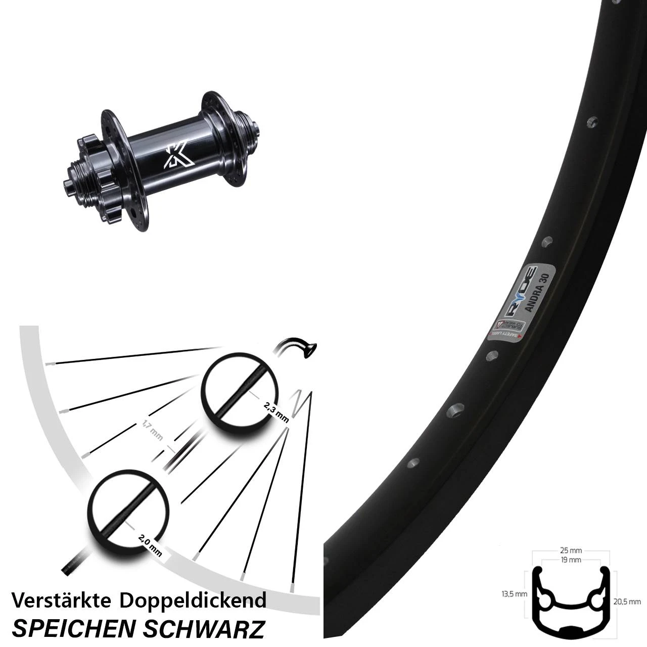 Technische Daten Vorderrad Ryde Andra 30 Disc schwarz mit Nabe KX-M Vorderradnabe 5/100 6-Loch