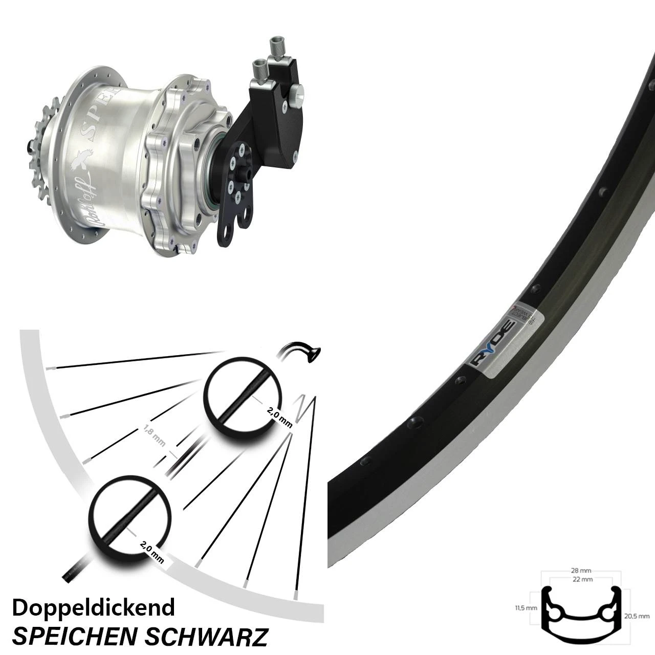 Technische Daten Hinterrad Ryde Andra 35 Felgenbremse schwarz und Nabe Rohloff Speedhub 500/14 CC DB silbern
