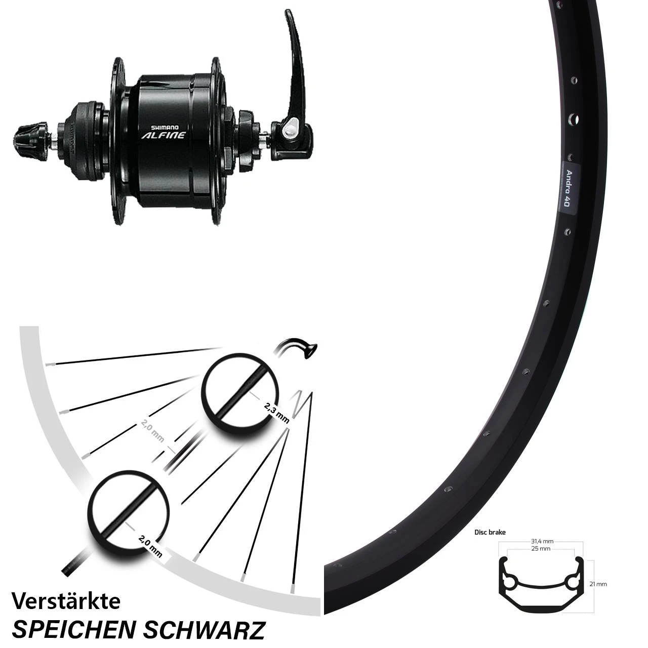 - Vorderrad 26 Zoll Ryde Andra 40 Disc schwarz mit Nabendynamo Shimano Alfine DH-S501 schwarz