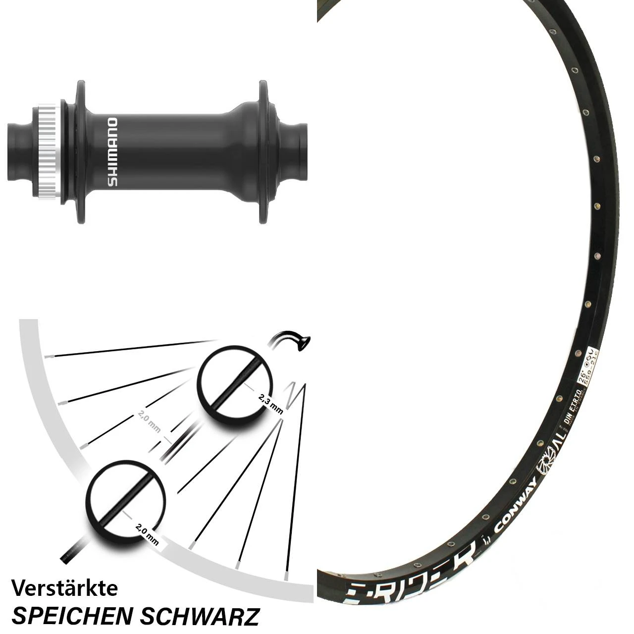 Das Vorderrad mit 26 Zoll Zoll GröĂe verfĂŒgt ĂŒber 100 mm Einbaubreite, eine ETRTO GröĂe von 21-559 mm und wird im Lastenrad Bereich eingesetzt. Es verfĂŒgt ĂŒber eine Ventillochbohrung von 8,5 mm und lĂ€sst sich an FahrrĂ€der mit Centerlock Scheibenbremsen einbauen. Es sind eine schwarze Shimano HB-MT410 schwarz Nabe und die schwarze Mach 1 Magma Disc Felge in das Vorderrad eingebaut. Diese verleihen ihm die nötige StabilitĂ€t fĂŒr Touren auf ebenen Strecken, sowie auch im GelĂ€nde. Das maximal zugelassene Systemgewicht liegt bei bis zu 150 kg. Sie können das robuste vordere Laufrad bei uns mit 32 schwarzen Speichen bestellen, um Ihr Bike ideal auszubauen! Der Einsatz erfolgt im Lastenrad Bereich.