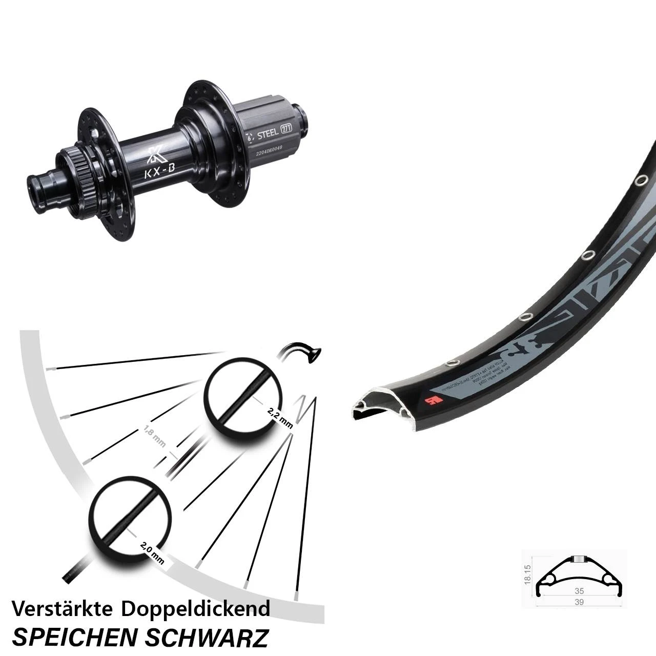 Technische Daten Hinterrad Rodi TRYP 35 schwarz und Nabe KX-B Boost Hinterradnabe 12/148 Centerlock Stahl Shimano 11-fach