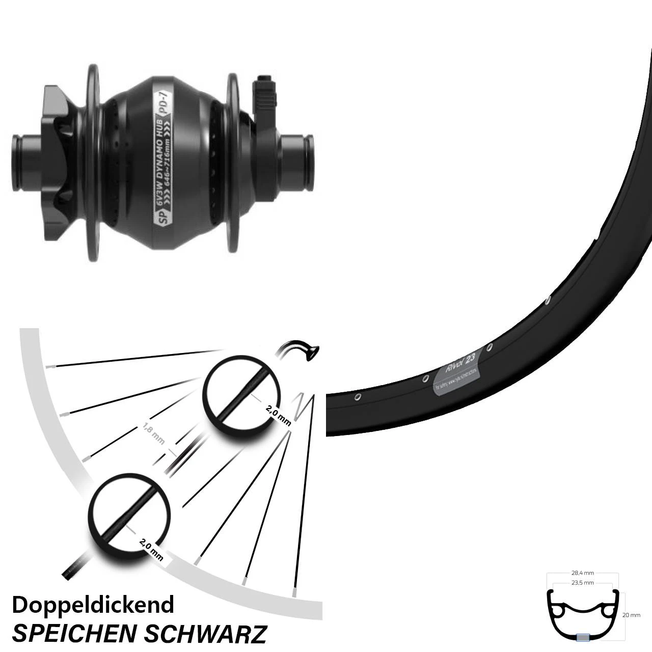 Technische Daten vorderes Laufrad Ryde Rival 23 Disc schwarz & Nabendynamo Shutter Precision PD-7 6-Loch schwarz