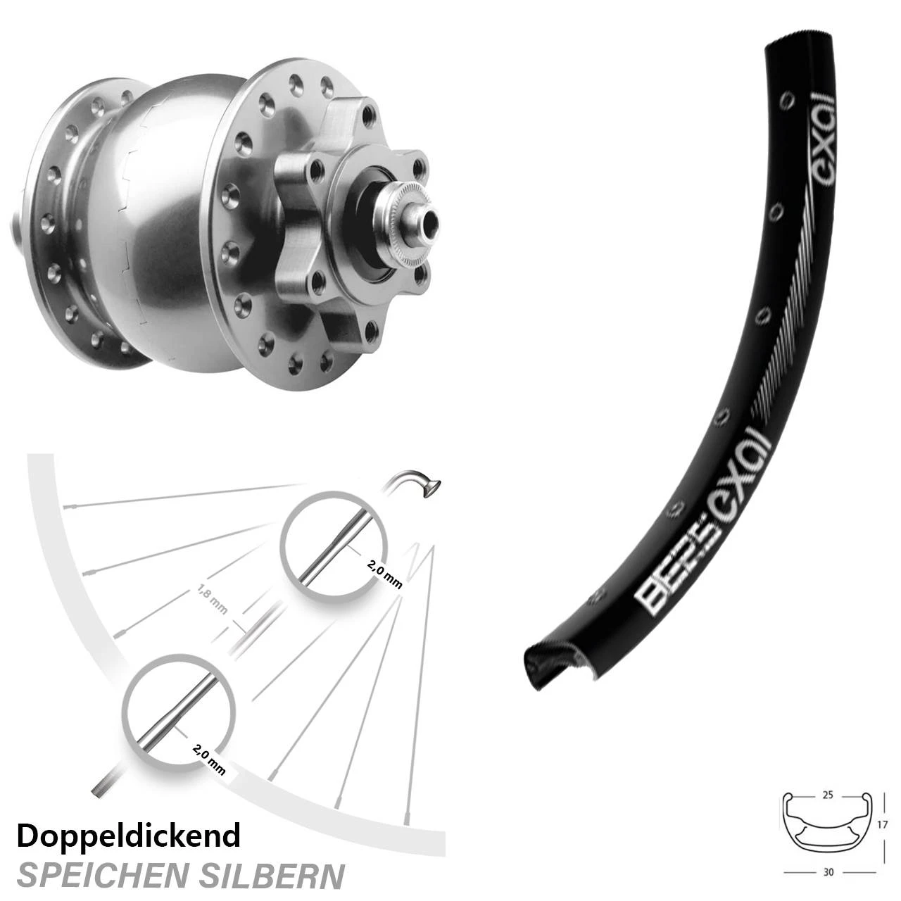 Vorderrad 26 Zoll Exal BE 25 Nabendynamo SON 28 6-loch 5/100 mm mit Doppeldickendspeichen