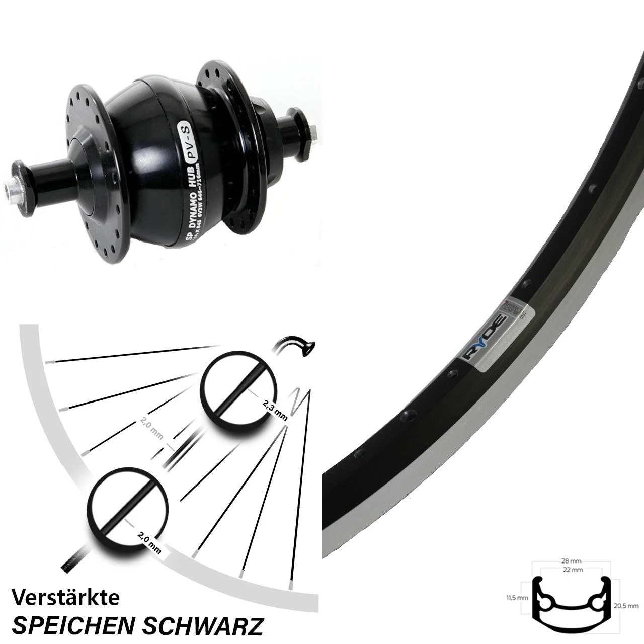 Technische Daten vorderes Laufrad Ryde Andra 35 Felgenbremse schwarz & Nabendynamo Shutter Precision PV-8 Felgenbremse schwarz