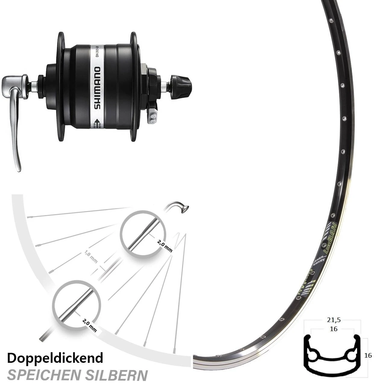 Technische Daten vorderes Laufrad DRC ST 16 Urban schwarz & Nabendynamo Shimano DH-3N31-QR schwarz