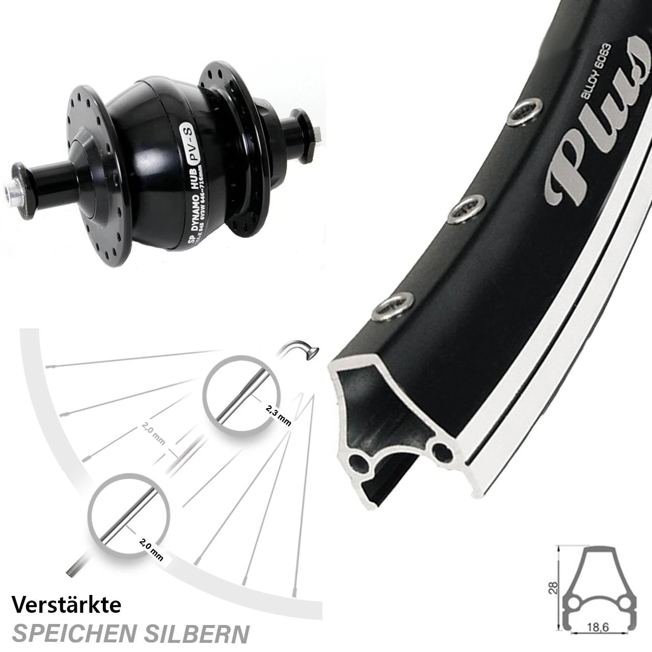 Technische Daten vorderes Laufrad Rodi Airline plus schwarz & Nabendynamo Shutter Precision PV-8 Felgenbremse schwarz