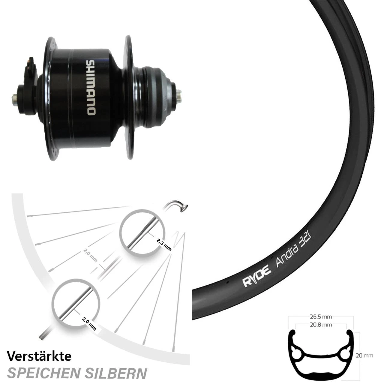 - Vorderrad 28 Zoll, 29 Zoll Ryde Andra 321 schwarz mit Nabendynamo Shimano DH-3D72 schwarz