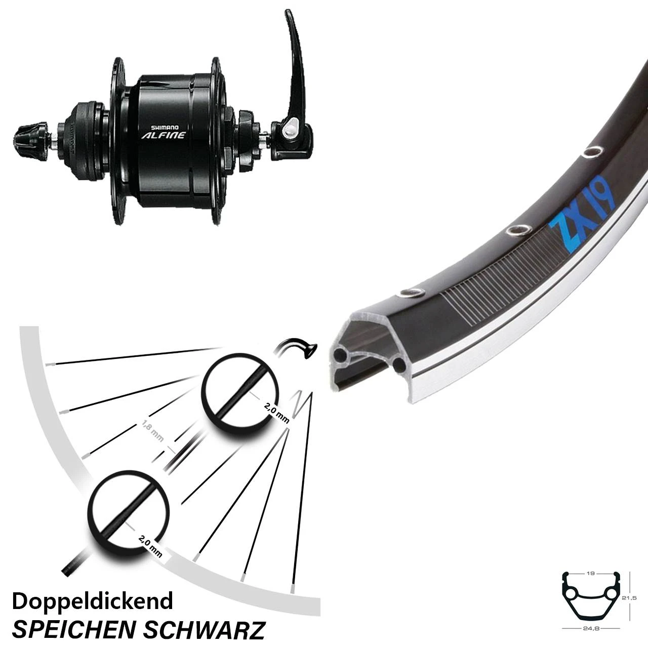 Produktbeschreibung Vorderrad Exal ZX19 schwarz 28 Zoll mit Shimano Alfine Nabendynamo