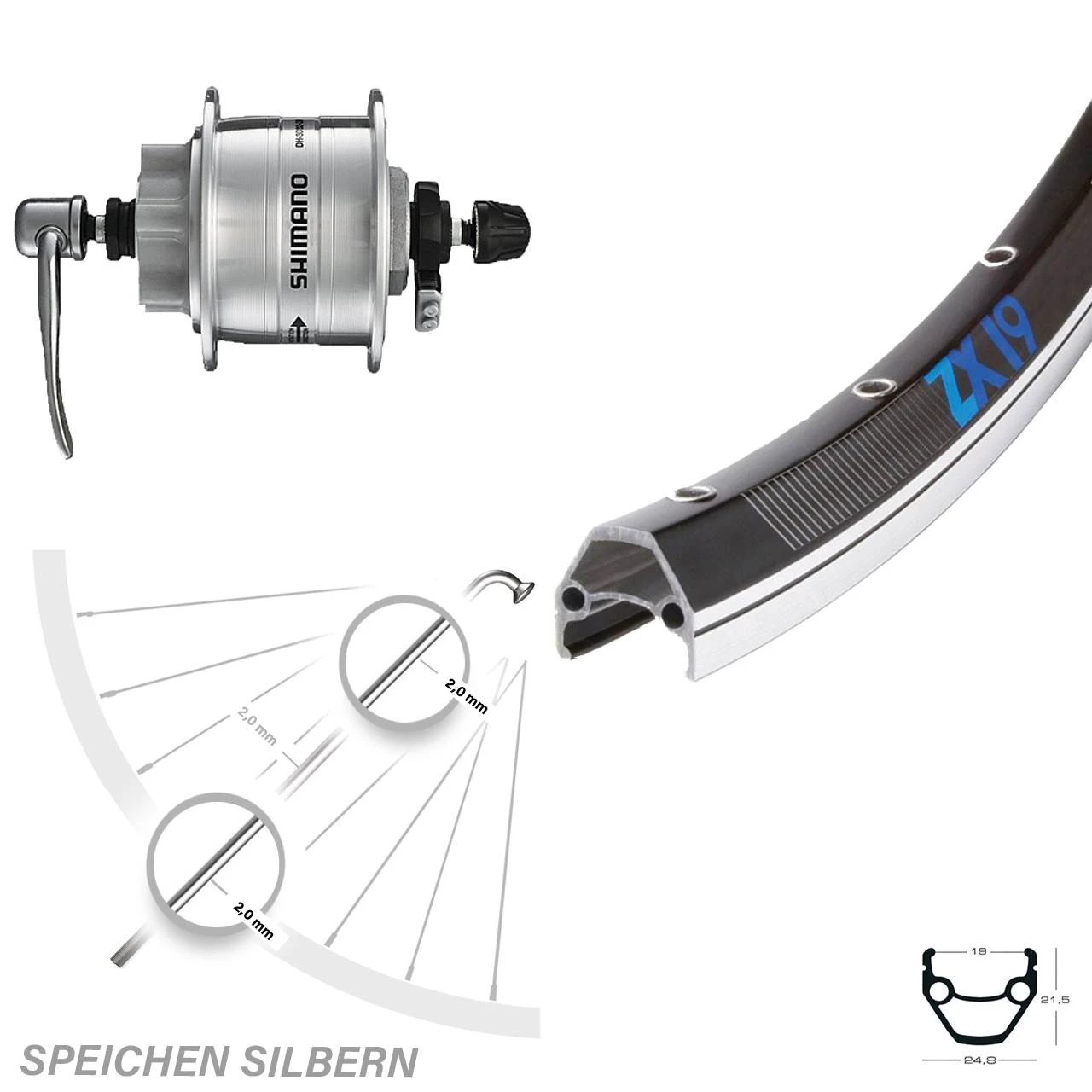 Technische Daten vorderes Laufrad Exal ZX19 schwarz & Nabendynamo Shimano DH-3D32-QR silbern